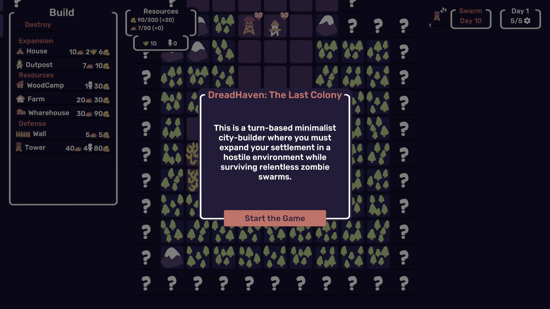 Dreadhaven: The Last Colony is a minimalist turn-based city-building strategy game set in a hostile, post-apocalyptic world overrun by the undead. Your mission is to expand, fortify, and withstand relentless waves of the undead.