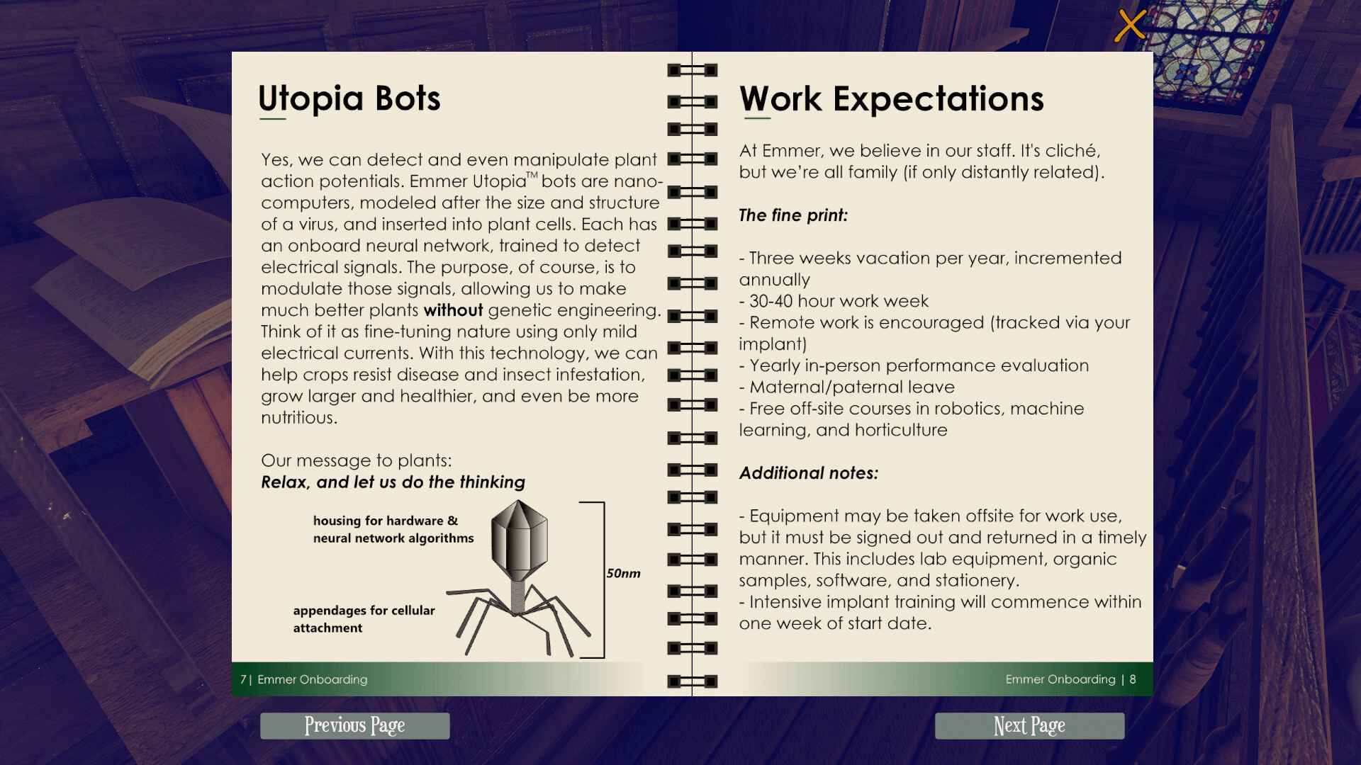 The agricultural megacorporation Emmer Technologies is intent on controlling the world-wide food supply with their novel UtopiaBot technology. Play as Dr. Teagan Wixx who must confront Emmer and their controversial food revolution as she also struggles with a complex and very personal mystery.