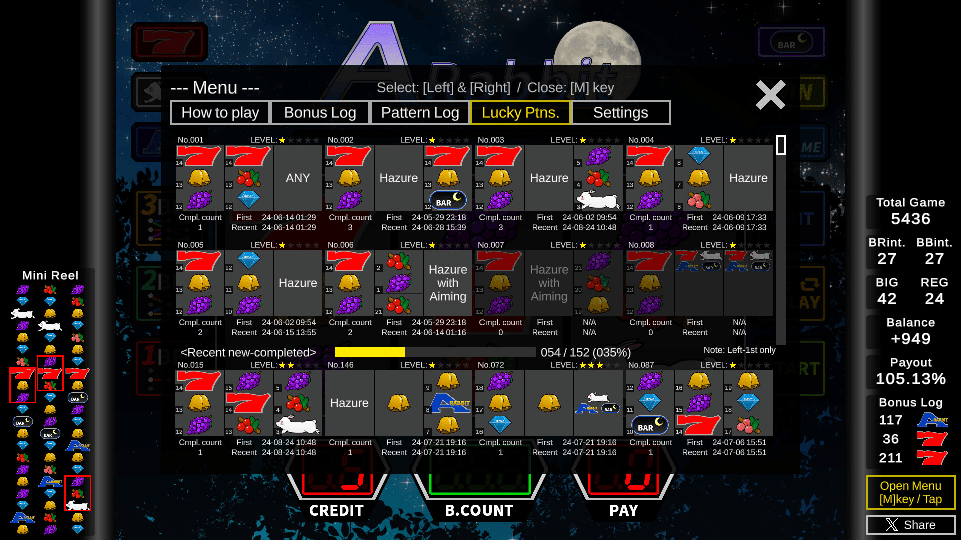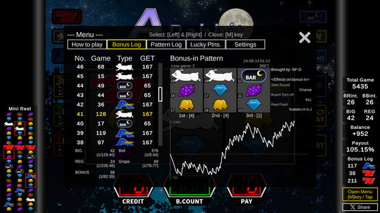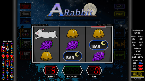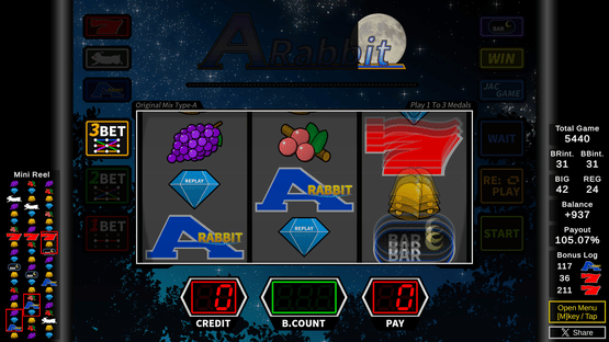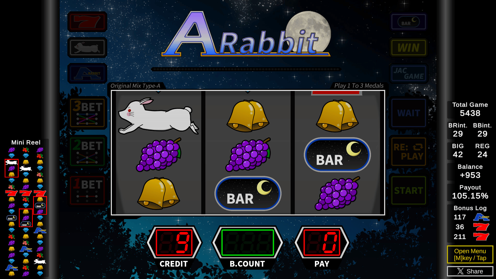 This is an original Japanese style slot machine! Reels are stopped by internal flag and your operation. BONUS will be hided at first when you get it. Find out BONUS by patterns, effects and navigation with knowledge and technique, like playing a puzzle game!