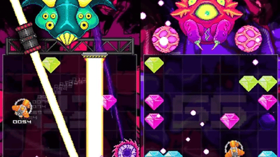 this game was originally designed with vertically-oriented touchscreen devices in mind. not necessarily phones specifically, but also larger touchscreen displays. over the course of working on it, a second control type was added which expands on the first - one where opposed to clicking to dash, the ship always follows the player's mouse/finger. this one proved to be really fun and twitchy. eventually, i decided to also add a keyboard-based one more in line with regular shmups. in this one, the player fires automatically, but is required to "mine" the crystals by hitting the boss, and your crystal combo is directly linked to how powerful your fire is. it's a little weird, admittedly, but this whole thing was kind of an experiment. Squeedge helped out by designing and realizing three awesome characters and a bunch of super cool boss designs, a little inspired by some of the pixel work Joker Jun did for Toaplan.