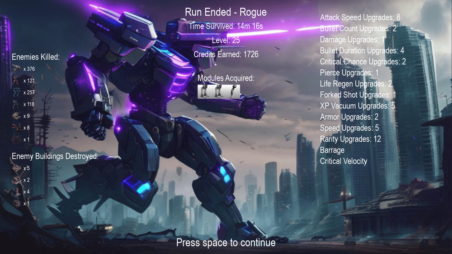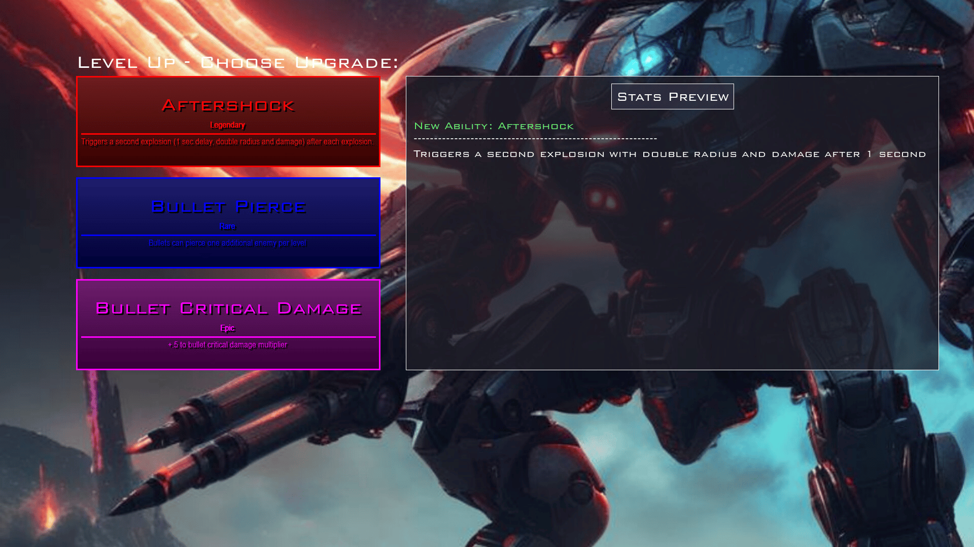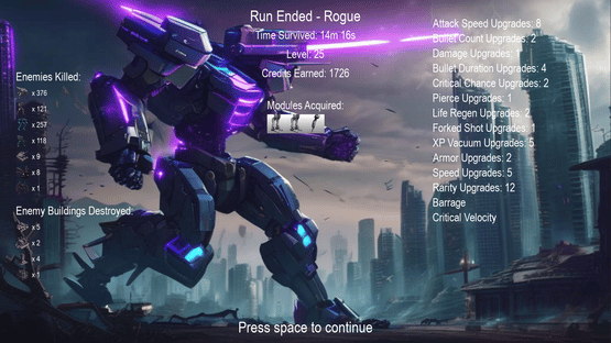 Dive into a world that blends frenetic roguelite reverse bullet hell action with deep systems and rich customizability. Mechanical foes rally against you in an ever changing technological war. Finetune your mech from one run to the next against a threat that's constantly advancing as well.