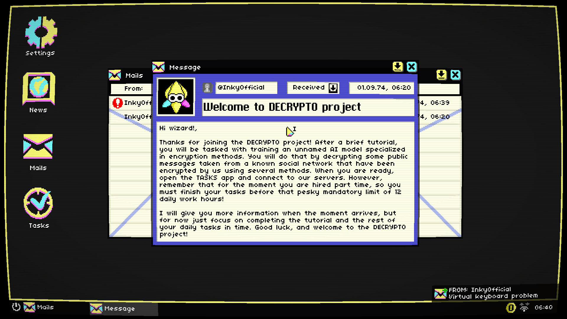 Our algorithm has chosen you for inclusion in the Decrypto Project. Your job is simple: we send encrypted texts, you decipher them. Loyalty and diligence will be rewarded with upgrades and customization options for your system. Disobedience and sabotage will be punished.