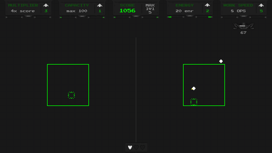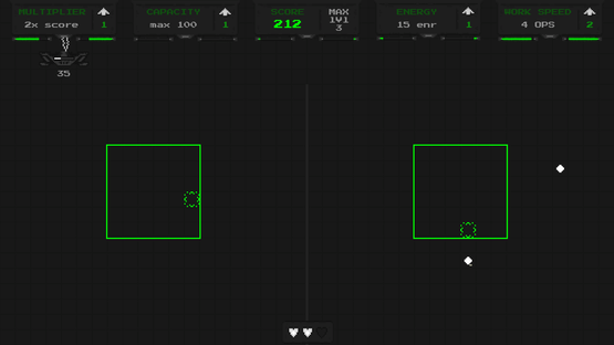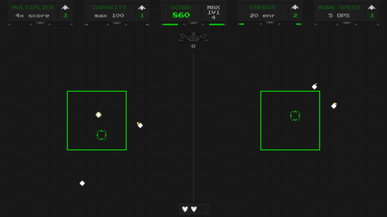 In this small arcade game, the player controls two catchers simultaneously—one on the right and one on the left. In the game, particles always move toward each other, and they must be caught at the point of collision using either the right or left catcher. If an annihilation is missed and it explodes, the player will lose one heart. Losing three hearts results in a game over.