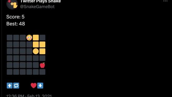 Тwitter Plays Snake was a game created by @PolyMarsYT that allowed you play the game of Snake on Twitter via likes and retweets.