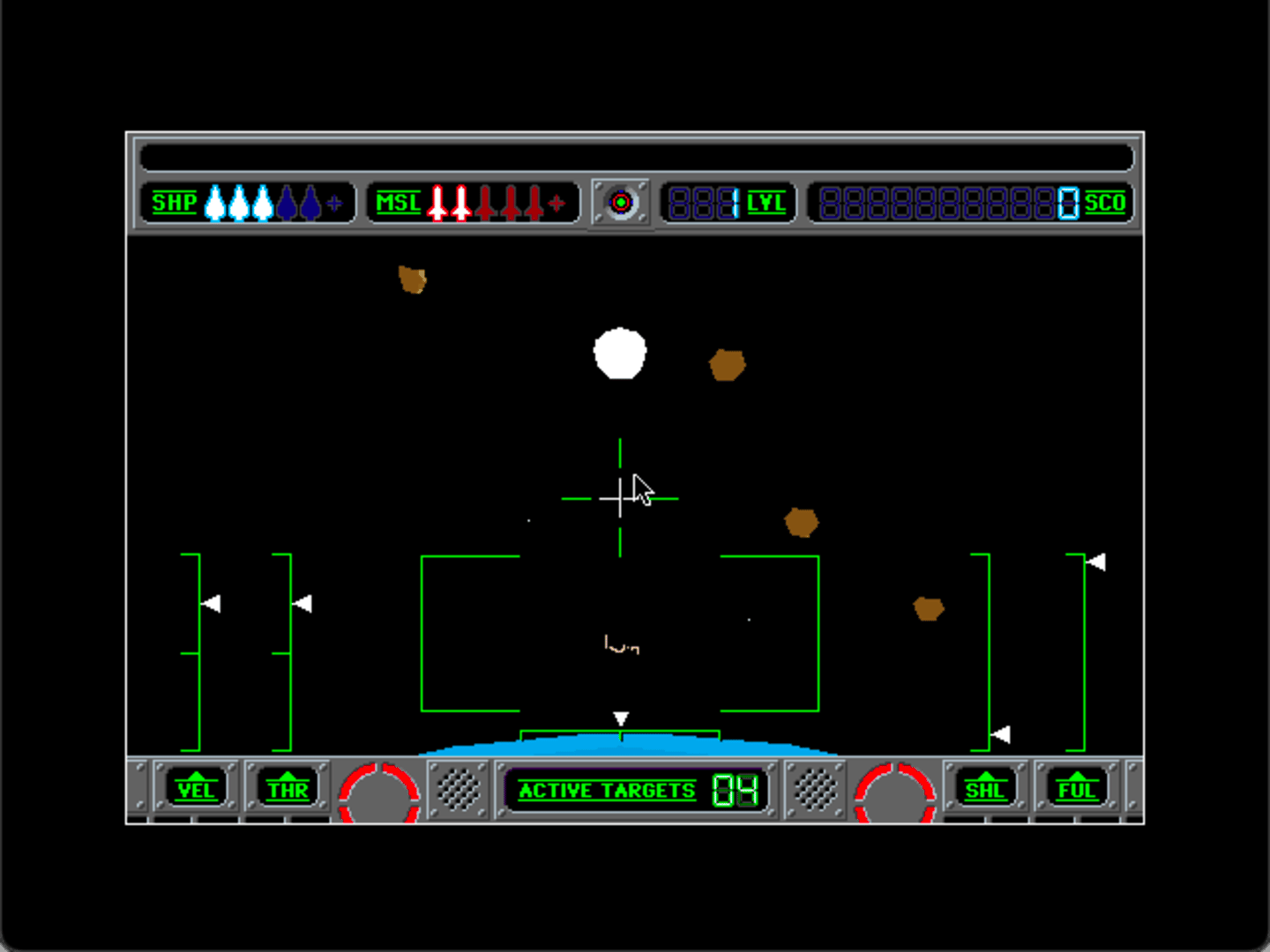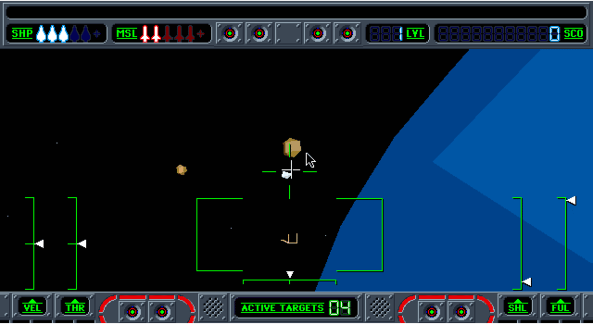 A 3D take on Asteroids that finds you defending an orbital space station from damage. You will have to deal with the deadly 5th waves (wave 5, 10, 15, etc.). A mother ship approaches your space station and you have to enter through an access tunnel in the rear of the ship and destroy its reactor core ... very difficult. As you progress through levels you can update various systems on your ship (to improve your engines, lasers, etc.). Also, more and varied types of enemy ship begin to swarm in on your space station - attacking you, pulling off segments of your space station, etc.