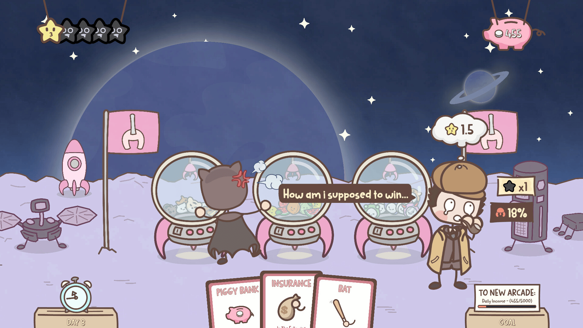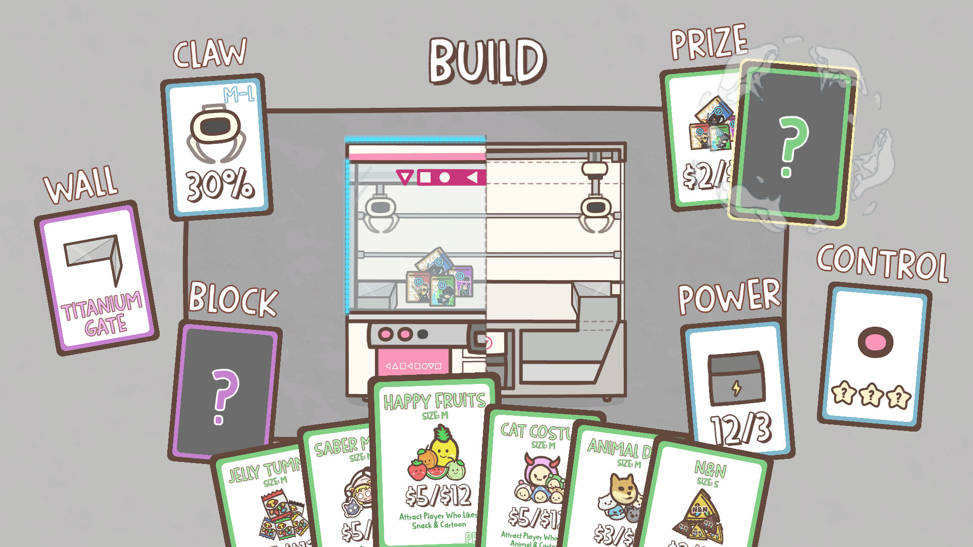 Prize Denied! Manage a claw machine arcade in this cozy management sim. Build challenging claw machines and play surprising cards to stop players from getting a prize! Earn money to unlock new arcades, collect cards, upgrade machines, and become the best arcade in the...UNIVERSE!