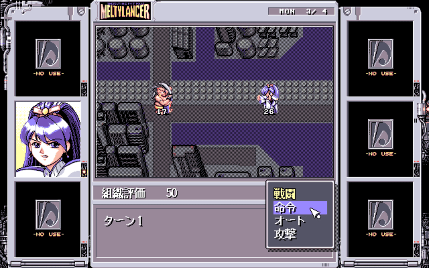 MeltyLancer is a life simulation game similar to -- and by the same designers as -- Graduation, in which the player is tasked with training a squad of six young Tokyo Eastern Metro Police recruits, called Lancers. The main core of the game is determining each Lancer's weekly schedule: which days are they on patrol, which days on standby, and which days do they have off? After the general schedule is determined, the player meets with each Lancer to speak with them directly, determining specific actions they'll take that week; whether they spend a day training, exercising, or getting some much-needed rest will affect their stats and ability to complete missions. While on patrol or on special missions, battles may occur, which can be partially controlled with a handful of commands but mostly play out automatically. Each of the six Lancers has their own abilities, personalities, and specialties. A mini-CD containing the game's theme song is also included in the package.