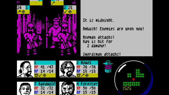 Wycheweald is a first-person role-playing adventure game for the Sinclair ZX Spectrum featuring exploration, minor puzzles and turn-based combat. It’s designed to run on 48K and 128K machines.