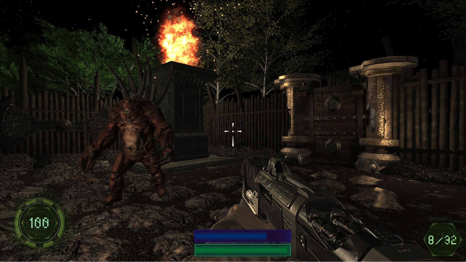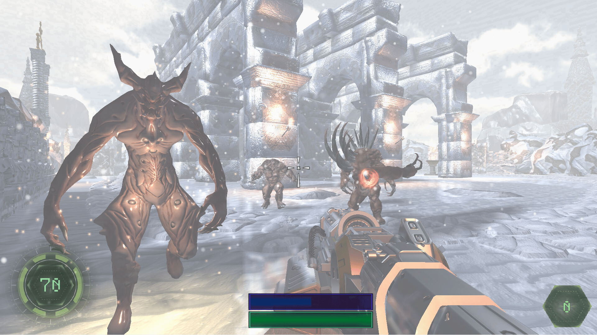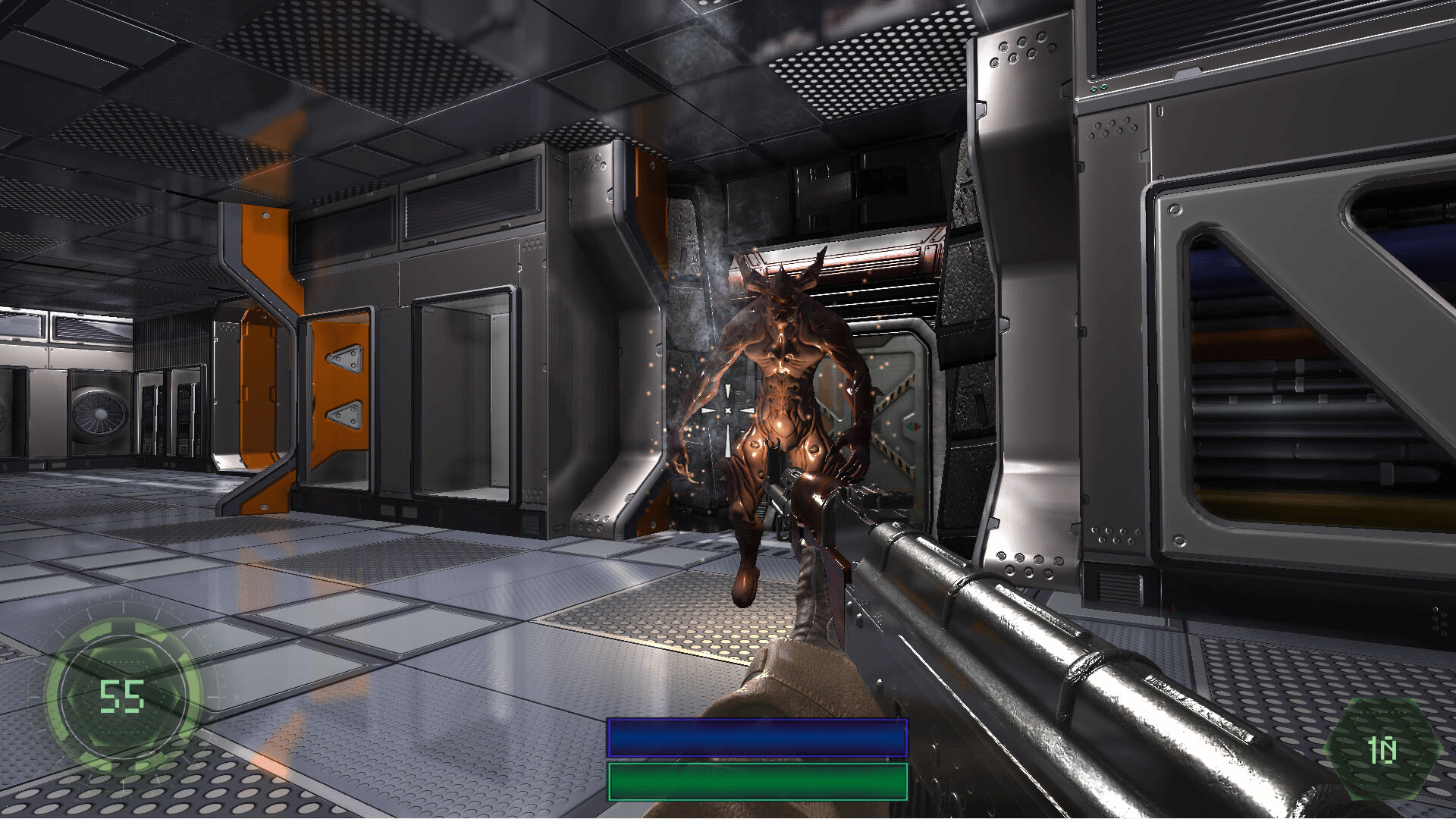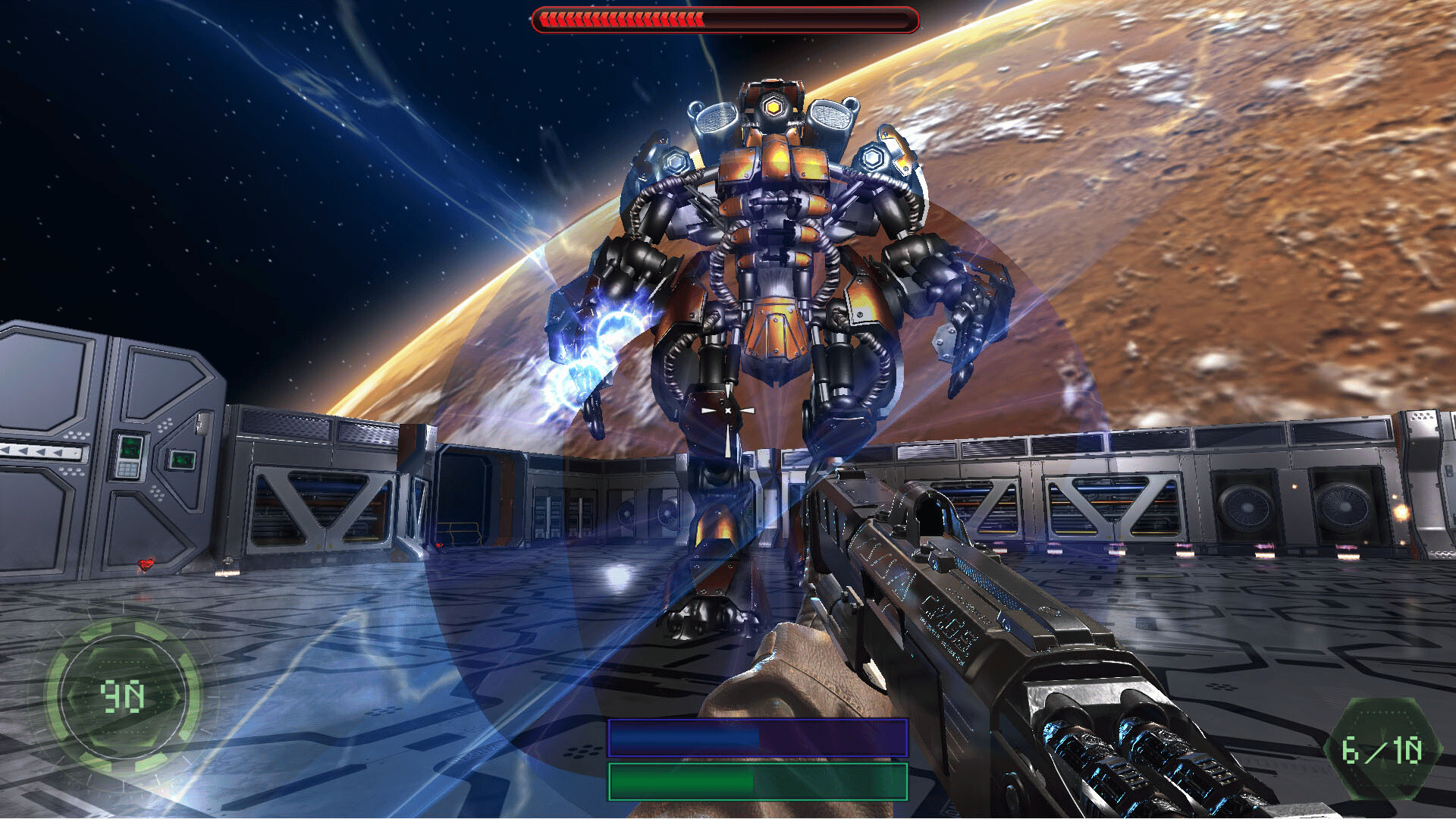 The game combines a first-person shooter with easy puzzles, as well as a scrolling shooter mode, where the player will have to fly a space plane.