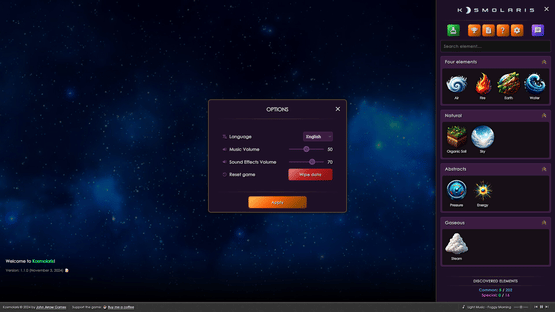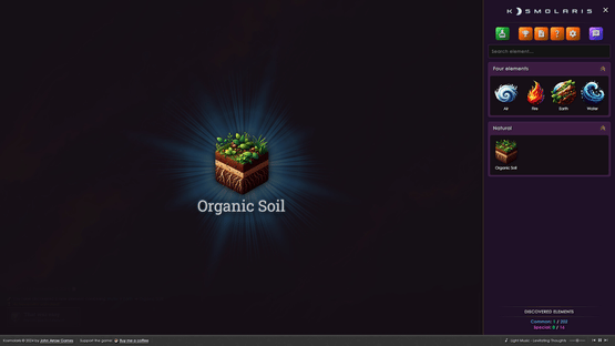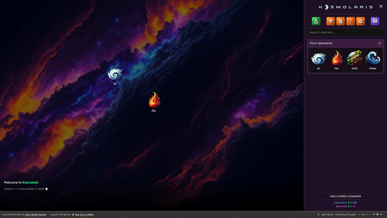 Kosmolaris is a relaxing puzzle game where you'll have combine a wide variety of elements to create new ones, starting with four basic elements: Air , Fire , Earth , and Water .