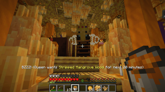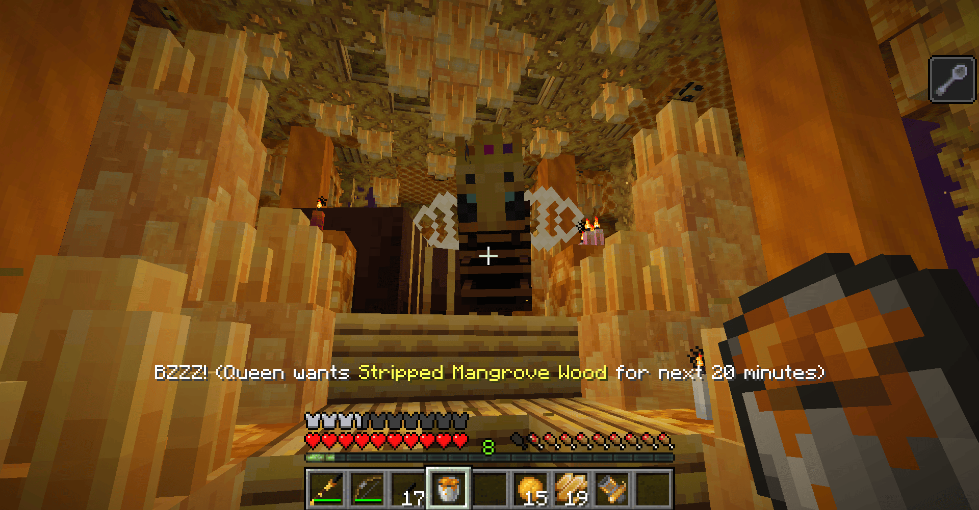 The Bumblezone is a bee dimension filled with many brand new bee-related blocks! There's even quite a few structures to explore and a unique bee armor you can obtain! If you are lucky, you may find a special Throne-Locating Honey Compasses from certain structures that leads you to a Bee Queen! The dimension itself looks like it is the inside of a bee nest and you will find giant walls in rows with canals of water between them. Maybe you'll even find a pollen covered section of the dimension or a canyon full of massive honey-based crystals! Check the Bumblezone advancements tab for how to enter dimension and what to do! Also, you will find bees are extremely protective of their honey in this dimension. If you mine vanilla's Honey Block, destroy or take honey from Honeycomb Brood Block, or you hit a bee, all bees around you will get many buffs and will become VERY angry at you because you now have the Wrath of the Hive effect! But by feeding bees or the Honeycomb Brood Blocks with the honey foods that you have, you might be able to calm them down. By feeding bees or that brood block, you get Protection of the Hive that makes bees defend you against anyone attacking you! (You can nerf the bees in the config if you find them too strong or buff them if you want to die!)