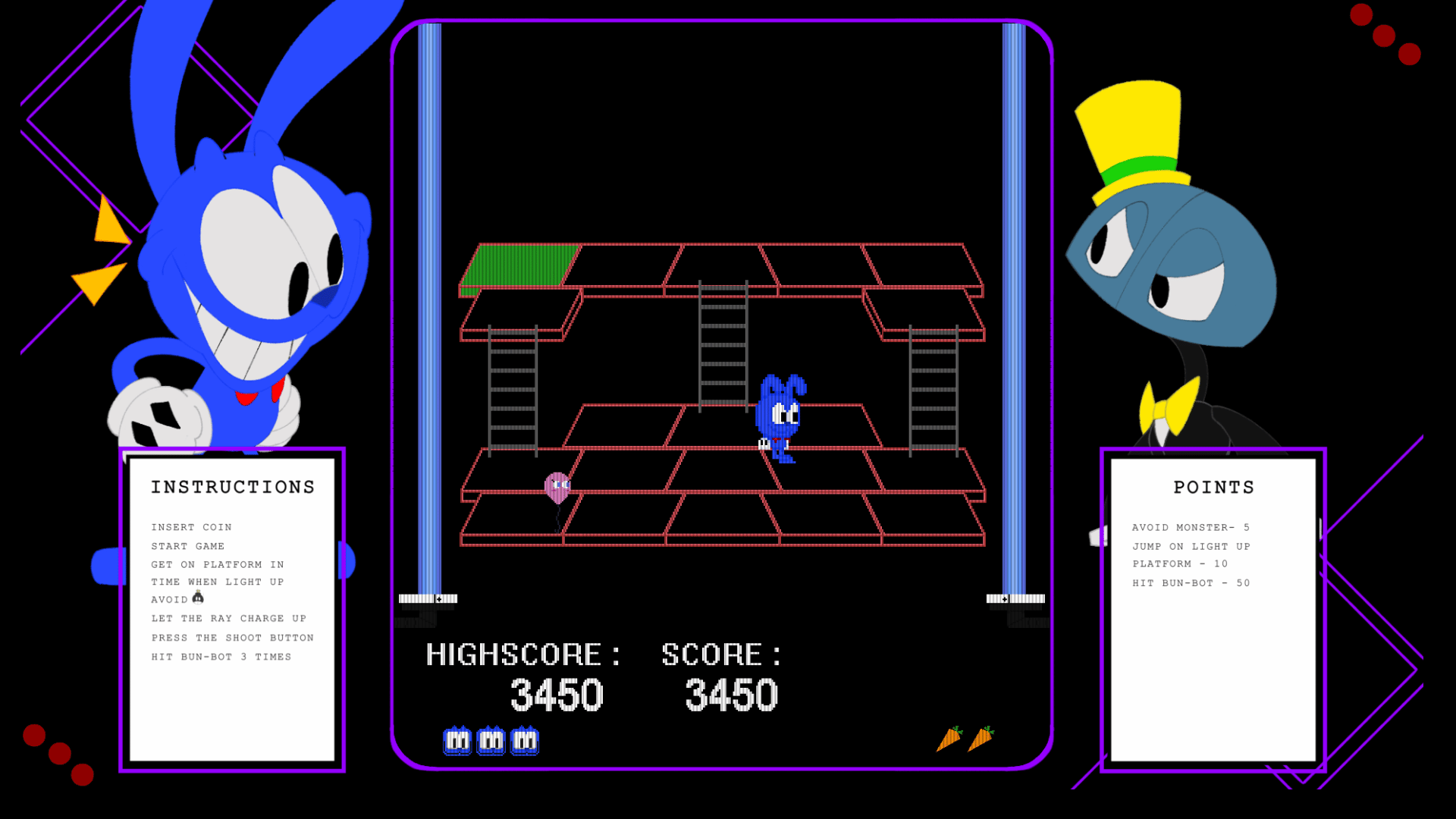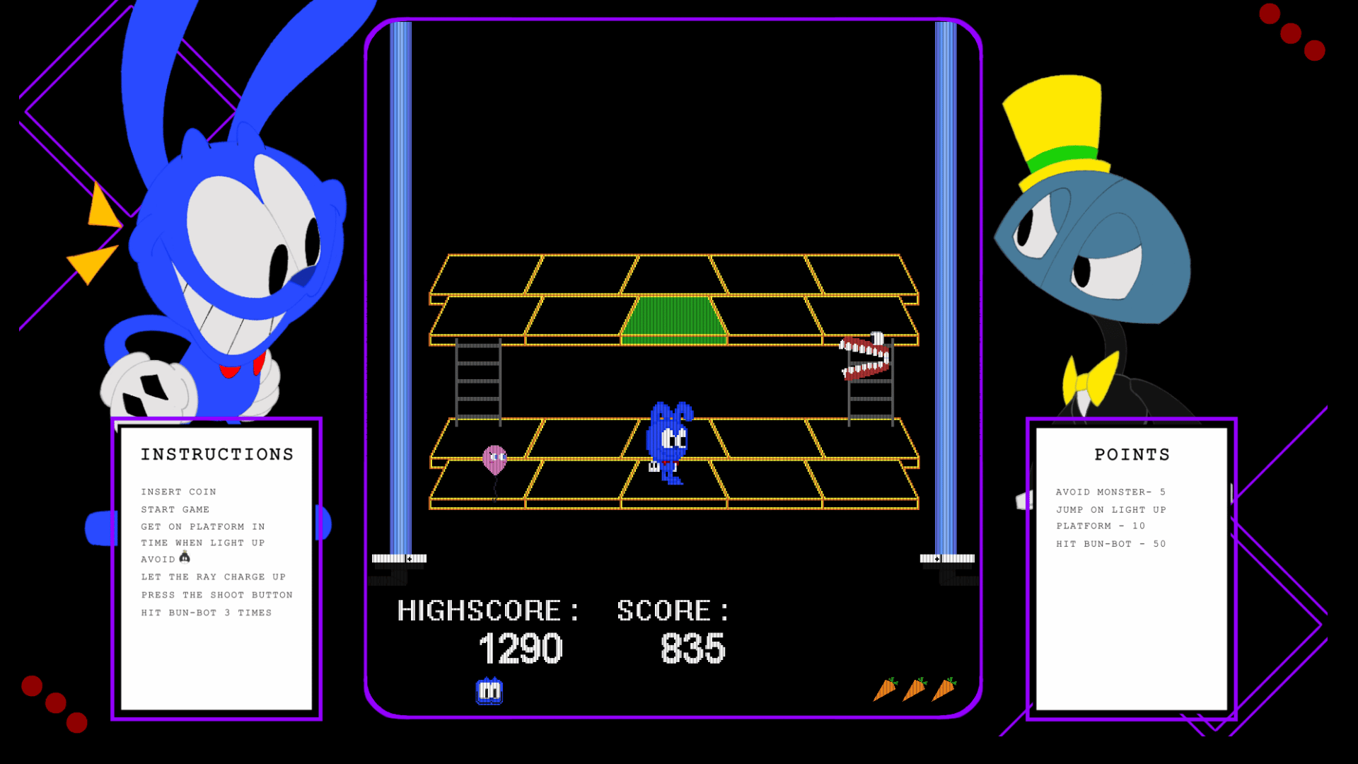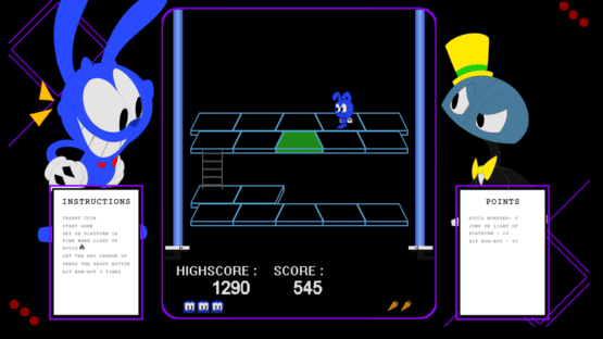 Bun-Bot has claimed the world as his domain, it is the task of our hero Tokei to destroy and reclaim what has been taken away. Jump on every platform that lights up and that on time or else Bun-Bot might throw something on our hero Tokei. Luckily he has the power to fight back by obsorbing the power of the platforms in his fur and once he is fully charged up it is time to shoot back!