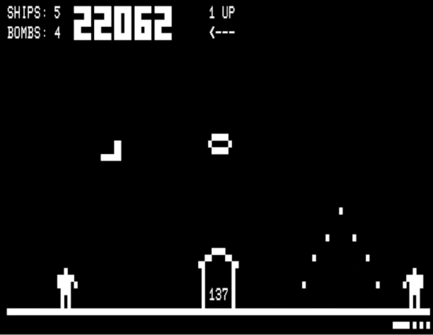Outhouse is a single screen shooter played from a side view perspective where the player has to defend the titular outhouse from toilet paper thieves. The outhouse is located in the middle of the screen and the thieves come wandering in from either side. The player controls a flying craft and has to shoot the thieves before they manage to reach the outhouse and get away with the paper. Once the thieves reach the outhouse they move back to where they came from leaving a trail of paper behind and if they leave the screen the paper is lost. If shot before they leave, the paper is returned to the outhouse. There are also squatters that enter the outhouse and use up some paper directly. Other obstacles and enemies include fireballs, zappers (that that move down the sides of the screen and shoot at the player) and other flying objects that needs to be avoided. In addition to the regular laser the player also has a limited amount of smart bombs that kill everything on screen. The game ends when there is no paper left, the outhouse has been destroyed or when the player has lost all his lives.