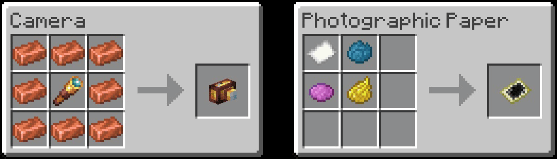This mod has been created to meet very specific needs. It adds a camera to easily take photos from the client renderer to enable the use of shaders while maintaining compatibility with vanilla clients. To clarify the mod is required on both server and client sides. Vanilla clients will still be able to join and see the photos, but will not be able to see or use the added features (which will be displayed as vanilla items), and the items and photos will remain in the world after the mod is removed.