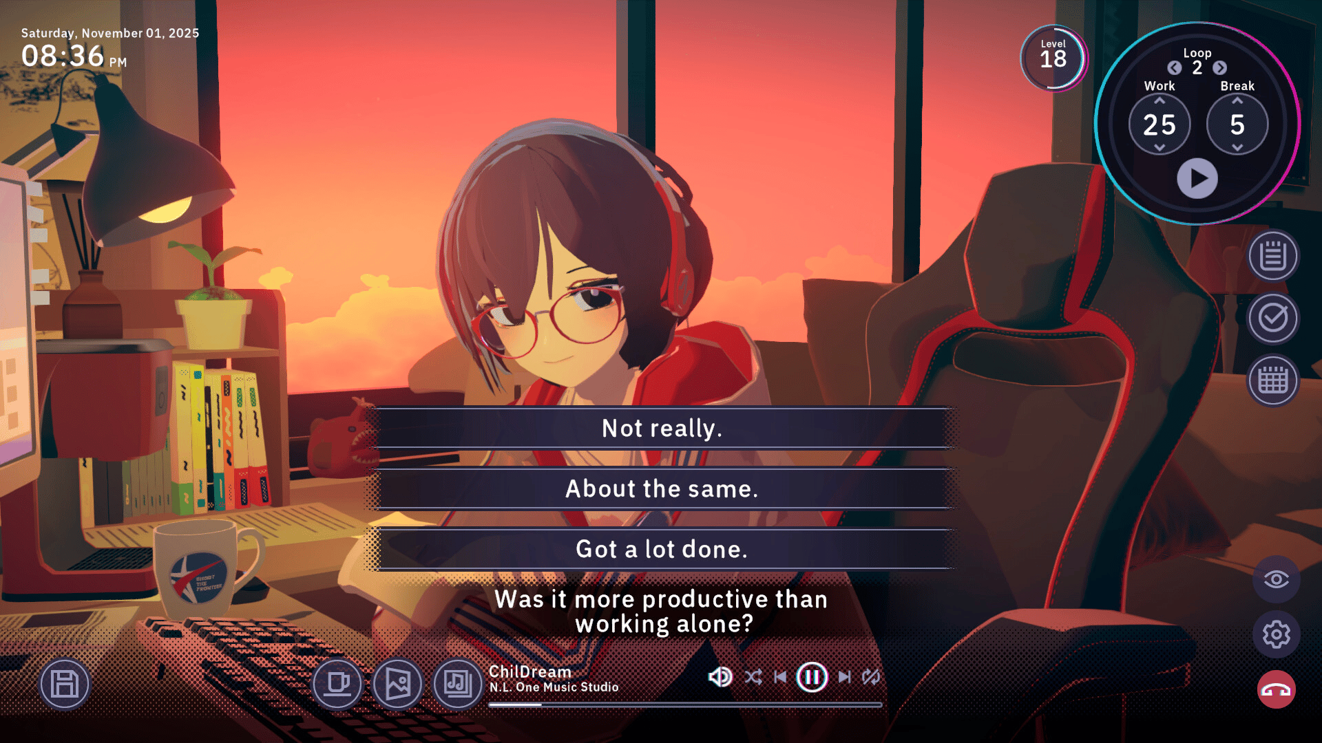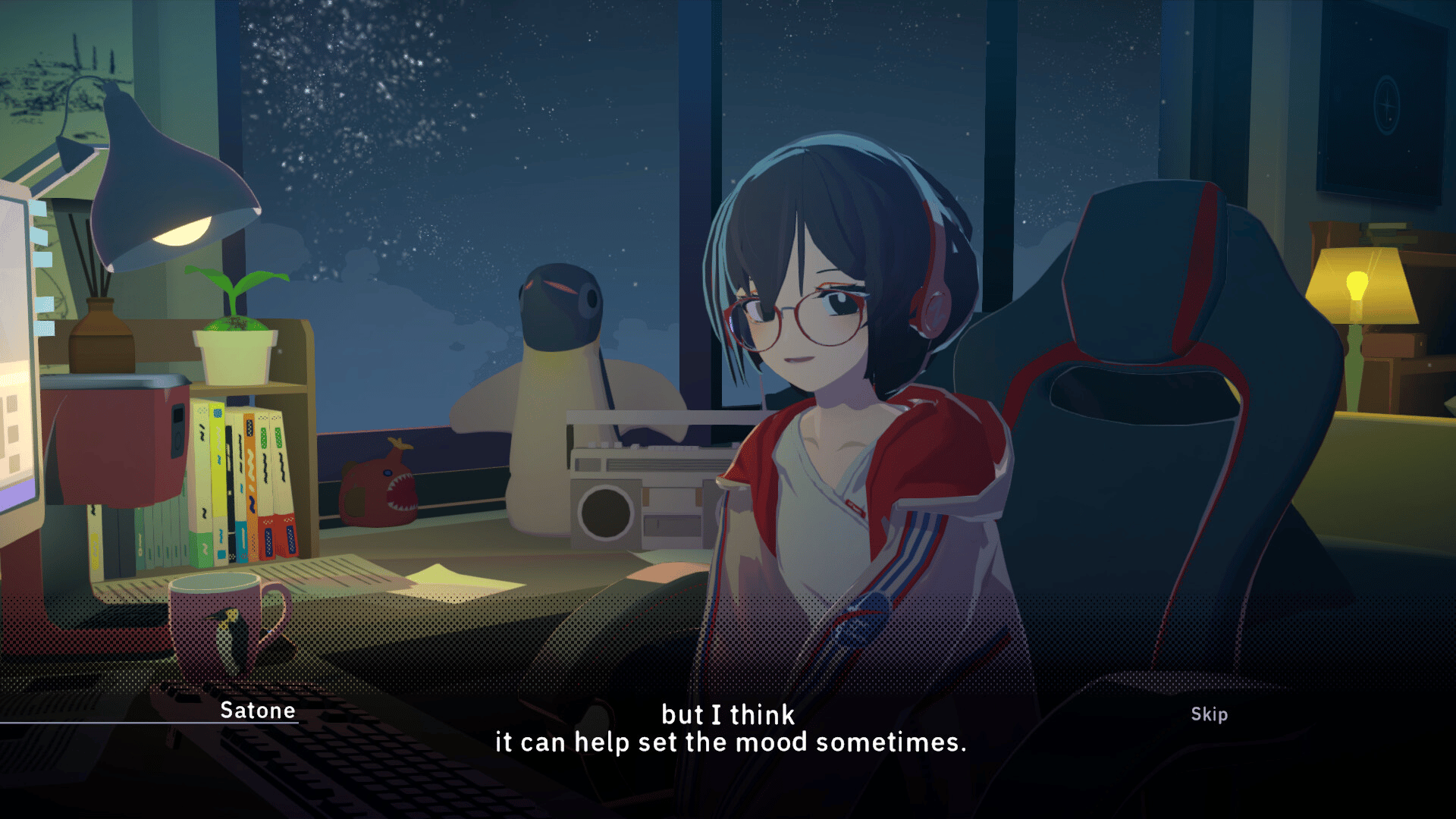 "Chill with You : Lo-Fi Story" is a sound novel game where you work alongside Satone, a girl who loves writing stories. Customize lo-fi music, ambient sounds, and landscapes to create a focused environment. As you deepen your bond with Satone, you may discover a special connection with her.