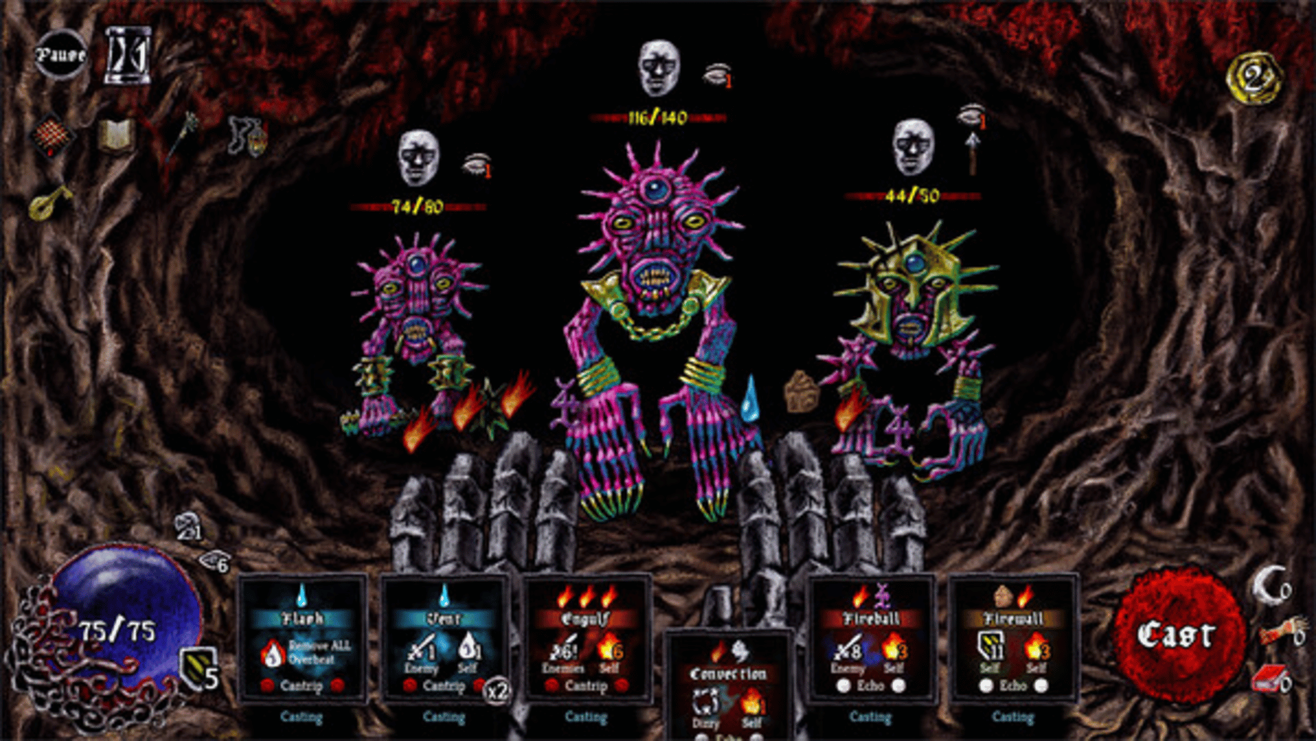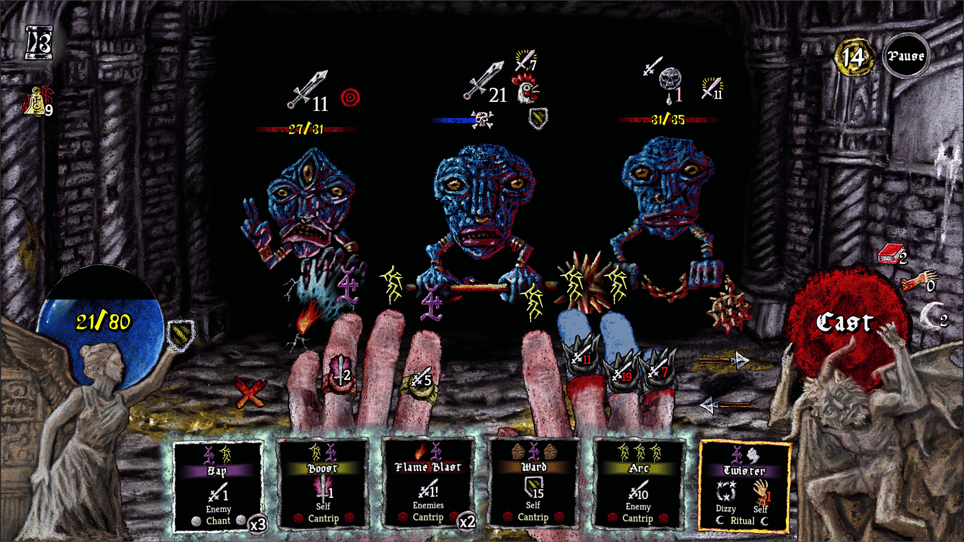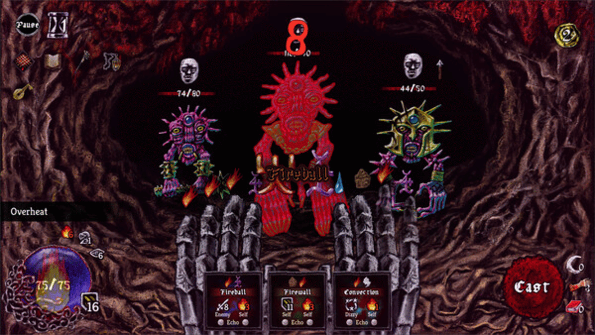 A roguelike deckbuilder where you fight with your fingers, spill some blood, and try to make it to your niece’s birthday on time. You’re a wizard. A not-so-heroic wizard imprisoned for wizard crime, awoken from your wizard slumber by an invitation from your niece. Escape from jail and traverse a hostile world crawling with danger. Every turn is a frenzy of spell sigils, cracking bones, and desperate gestures as you shred through monstrosities with raw elemental power. You’re not the chosen one, you’re just trying to be a good uncle.
