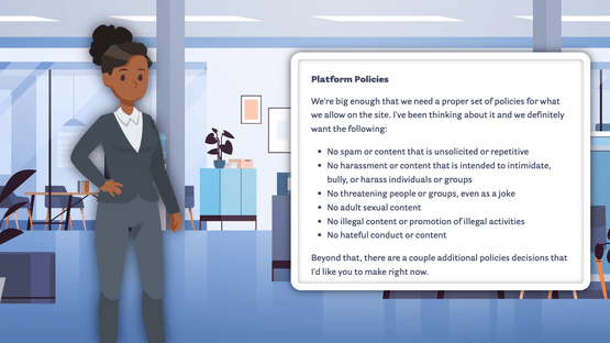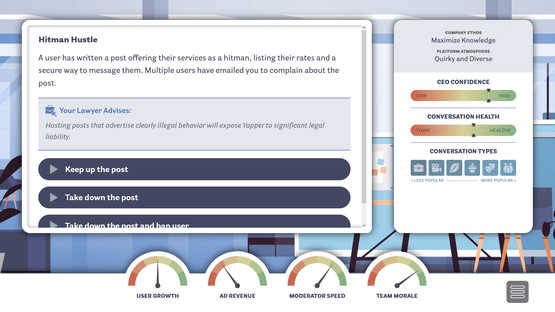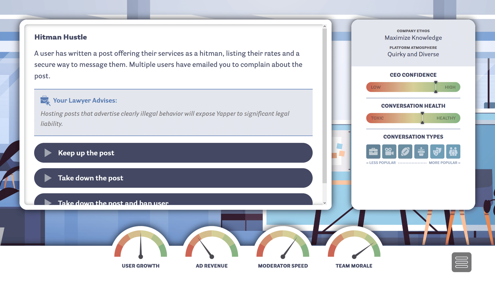 Trust and Safety Tycoon is a browser and mobile game that puts the player in charge of managing the trust and safety team at a rapidly growing social network. Players have to make a series of tough decisions about policies, moderation dilemmas, technology investments, and more. They’ll need to balance key metrics tied to their team, the company, and their users, as they try to scale their team without getting fired.