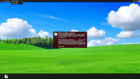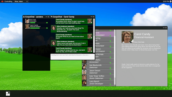 YOU ARE NOT ALICE is a social engineering sandbox game where you play the role of a hacker who has taken over Alice's work computer. Your goal is to spread through her company by talking to her coworkers and convincing them to run a virus file you can send them.