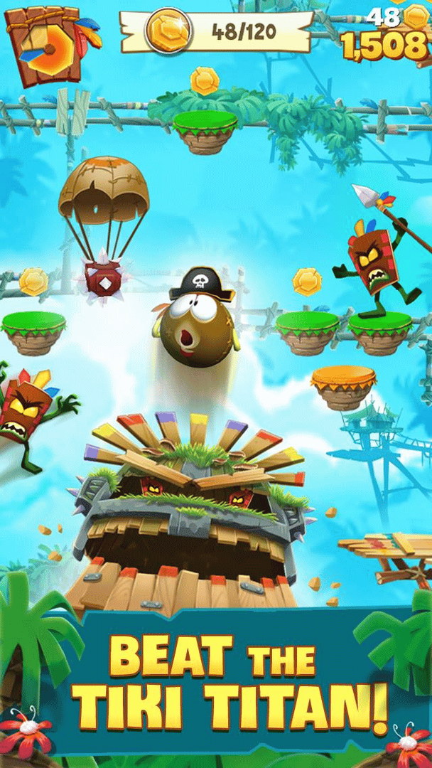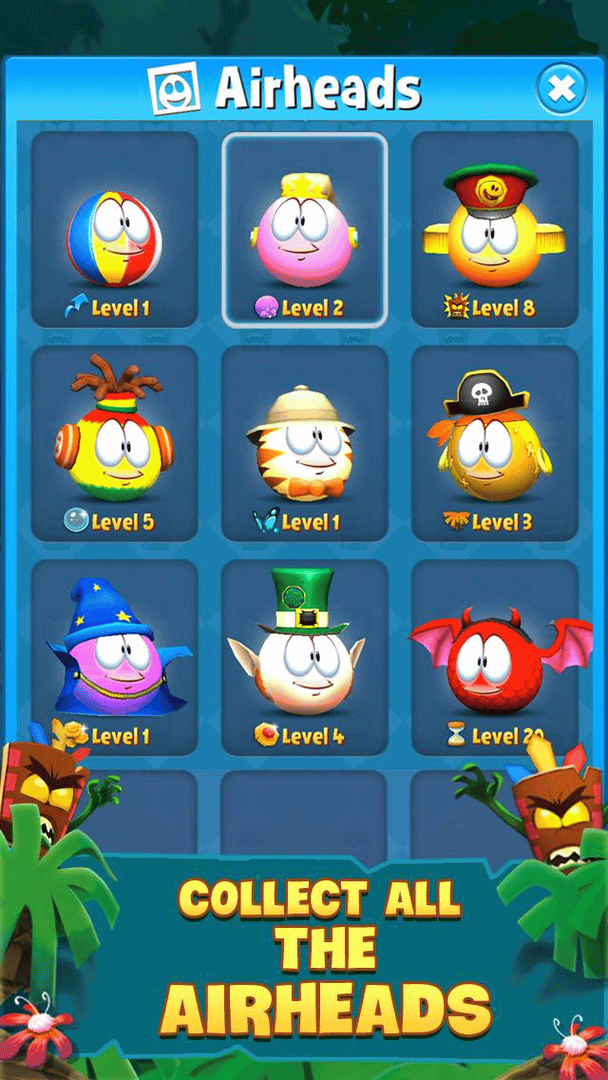 From the developers of the mega hit Skyline Skaters comes the newest jump craze — Airheads Jump! Get involved with the latest non-stop arcade jumping action game for free today. Once you hop, you can’t stop! Oh No! The Airheads have crashed their plane and been captured by the angry Tikis. Free them all to unlock awesome new characters, but watch out for the terrifying Tiki Titan hot on your tail. Tilt and tap your device in a jungle hop to the top! Use platforms and power ups to bounce your way through over 100 levels, including catching butterflies, smacking Tikis and freeing your fellow Airheads.