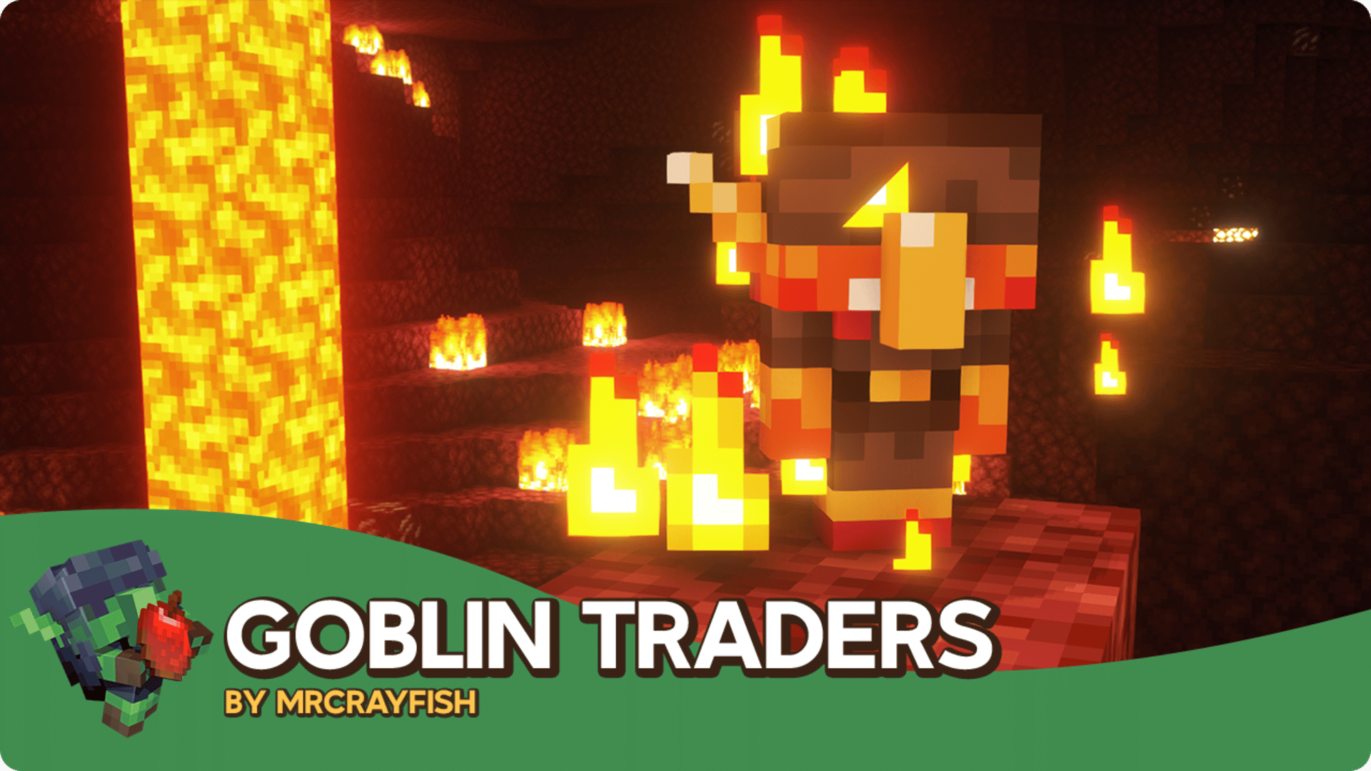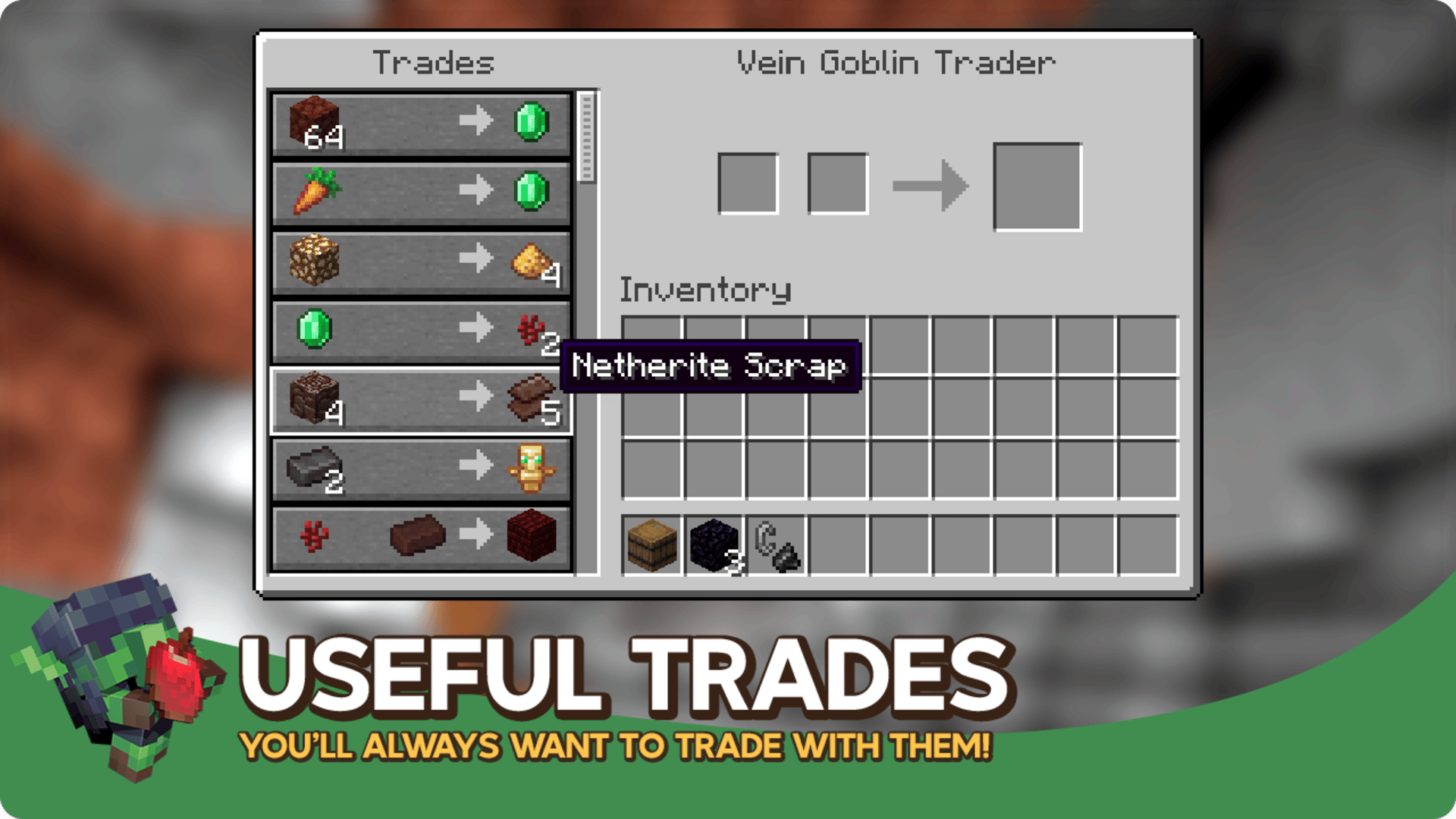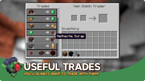 Goblin Traders is a simple mod that adds goblins which have unique trades. Similar to Wandering Traders, goblins are found randomly underground in caves or in the nether and provide exclusive and beneficial trades that allow you to take your adventure to the next level! Goblin Traders adds two new traders, the Golbin Trader which is found in the overworld and the Vein Goblin Trader which is found in The Nether; both with their own unique set of trades. These little goblins have a little attitude and don't like it when you hit them. If you're feeling generous you can feed them their favourite food for a fun animation.