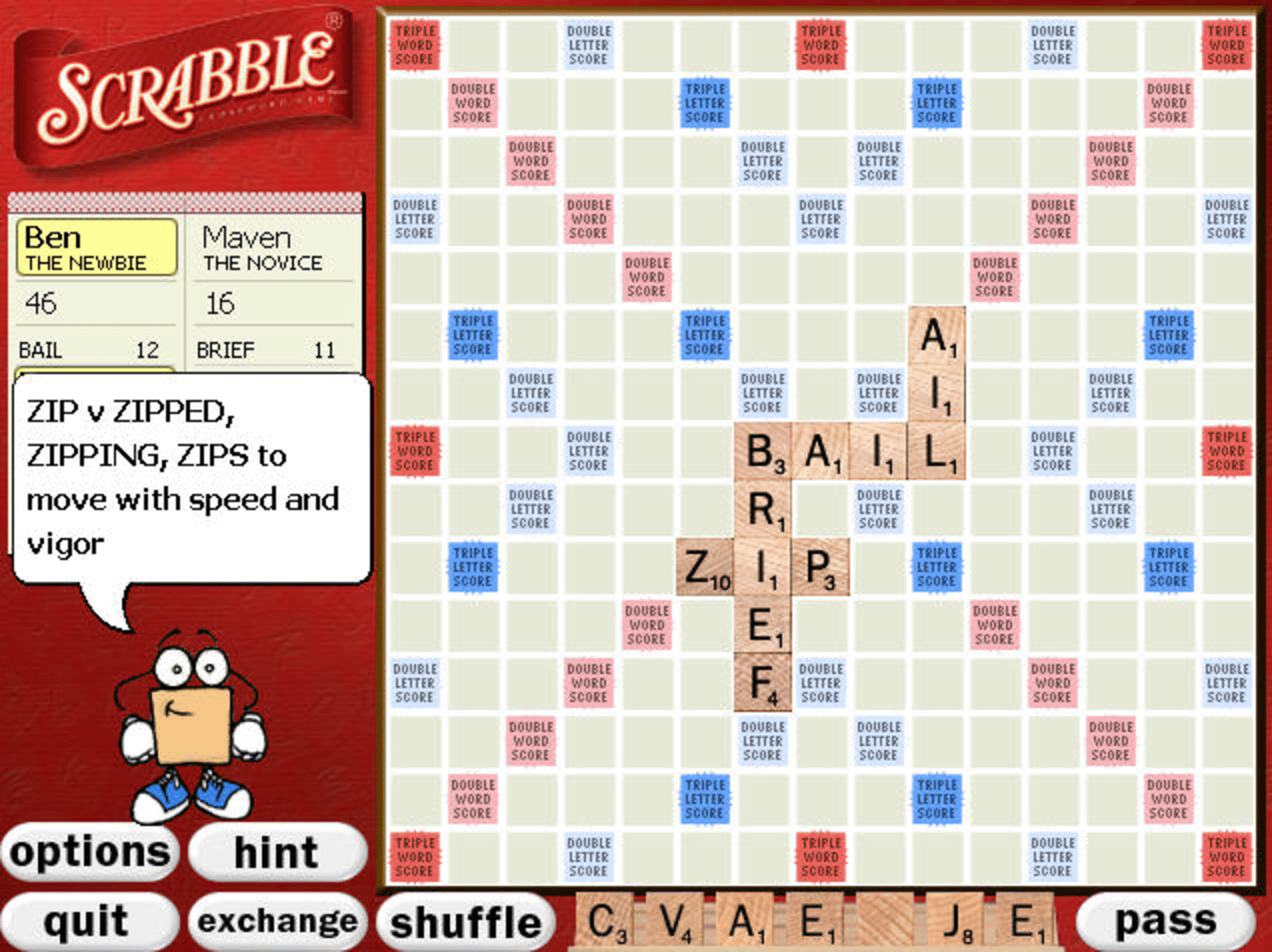 Welcome to Scrabble! This version of Scrabble features an artificial intelligence (AI) named Maven who will both challenge you and teach you new words.