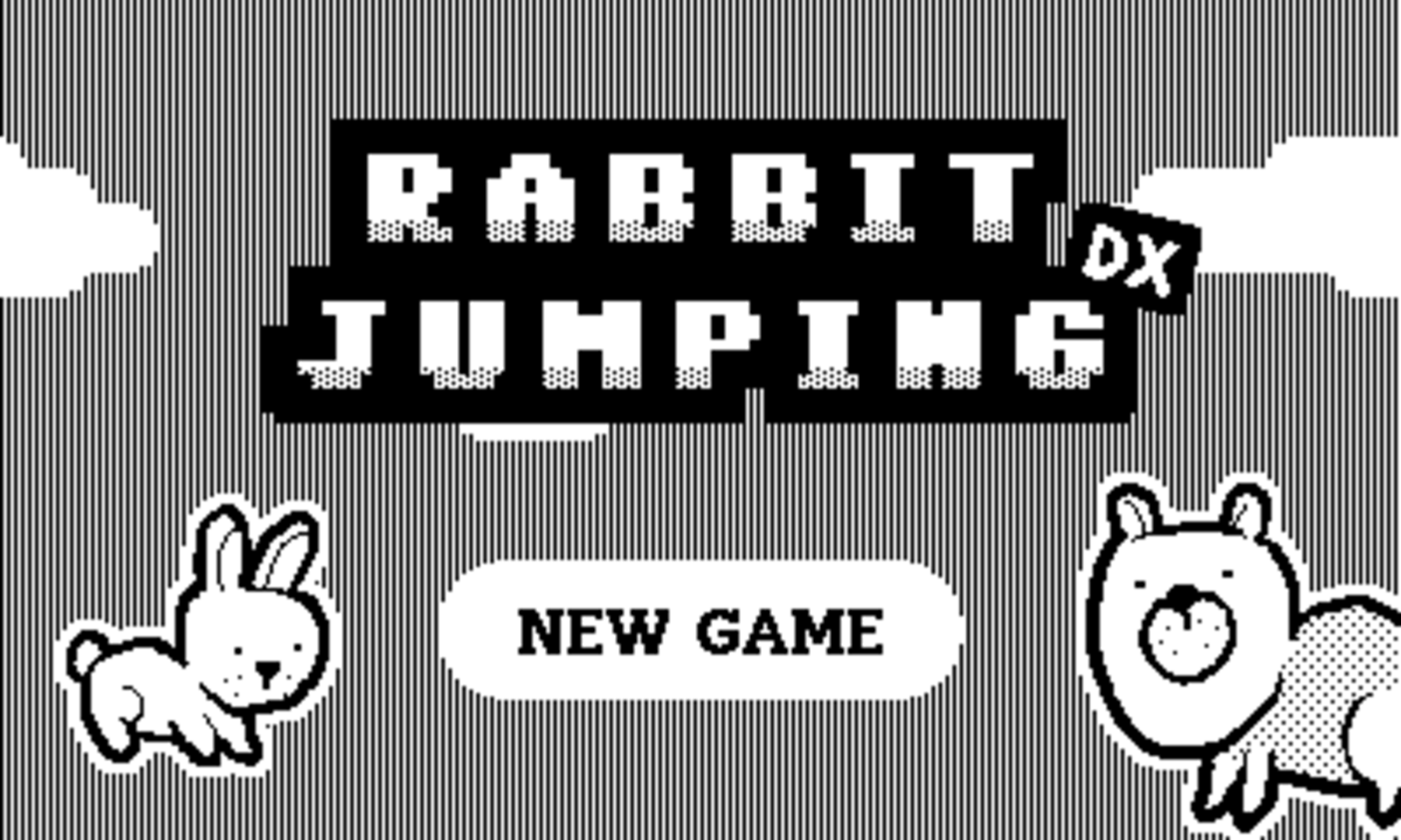 Rabbit Jumping DX is the not-at-all-anticipated follow up to a game almost no one has played, this time with less colour, and more of almost everything else. Run, jump, and crawl through five side-scrolling stages filled with bears, foxes, and other dangers as you rescue the lost bunnies. (If you want to, no pressure.) Don't be fooled by the cute graphics, this game is tough as nails, but with persistence or maybe a lucky rabbit's foot I'm sure you'll reach the end Features a catchy retro soundtrack that is sure to get stuck in your head, super smooth gameplay at 48-ish frames-per-second, and a progress save feature for when you need to take a li'l break. Enjoy!