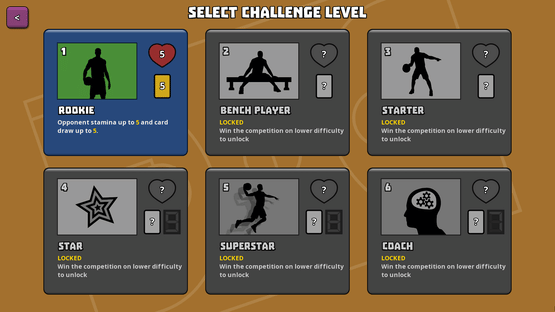 Shoot threes, slam dunk, block opponent shots and steal the ball. Rebound and run fast breaks. Call timeouts and substitute players. Every basketball action is a card. Manage the time remaining on the game clock. Win 4 games in a row to become a champion!