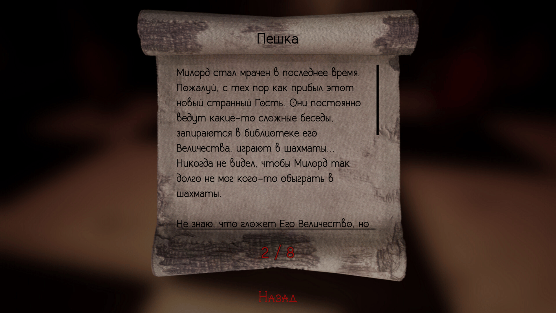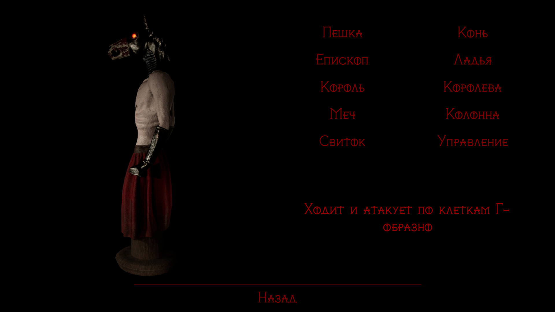 «I Checkmate Thee!» - this is the inscription the King will see every time he makes a wrong move. But this is not the end of the story, but the start of a new game. The lonely Hero is locked in the body of the King, imprisoned on a chessboard, only a sharp sword that slays the enemy with one blow will help him pass several games against the opponent's chess pieces, playing by the rules of chess. The fading light of the torches will show the countdown of the move, but the thickening darkness will hide the opponents in the darkness; and only their eerie voices and glowing symbols will tell the King how not to get checkmated again, not to see the inscription «I Checkmate Thee!» and start all over again. On the black and white squares, the King will meet not only animated and beautifully-designed three-dimensional living enemy pieces, but also his own dead ones: pawns, bishops, knights, and the queen. On some of them you can find scrolls, collecting which, you can learn the secret of liberation from the chess trap. You can hide from enemy attacks behind the dead chess pieces, and strike enemy pieces with sword blows, each time creating a new path for the King, where each new move is a step towards death! «I Checkmate Thee» is an unexpected game combination that combines elements of horror and chess on a chessboard. There are no words in the game, a minimum of text, and everything that is important for passing is shown in the surrounding world. Try to pass this test, seeing the phrase «I Checkmate Thee!» again and again.