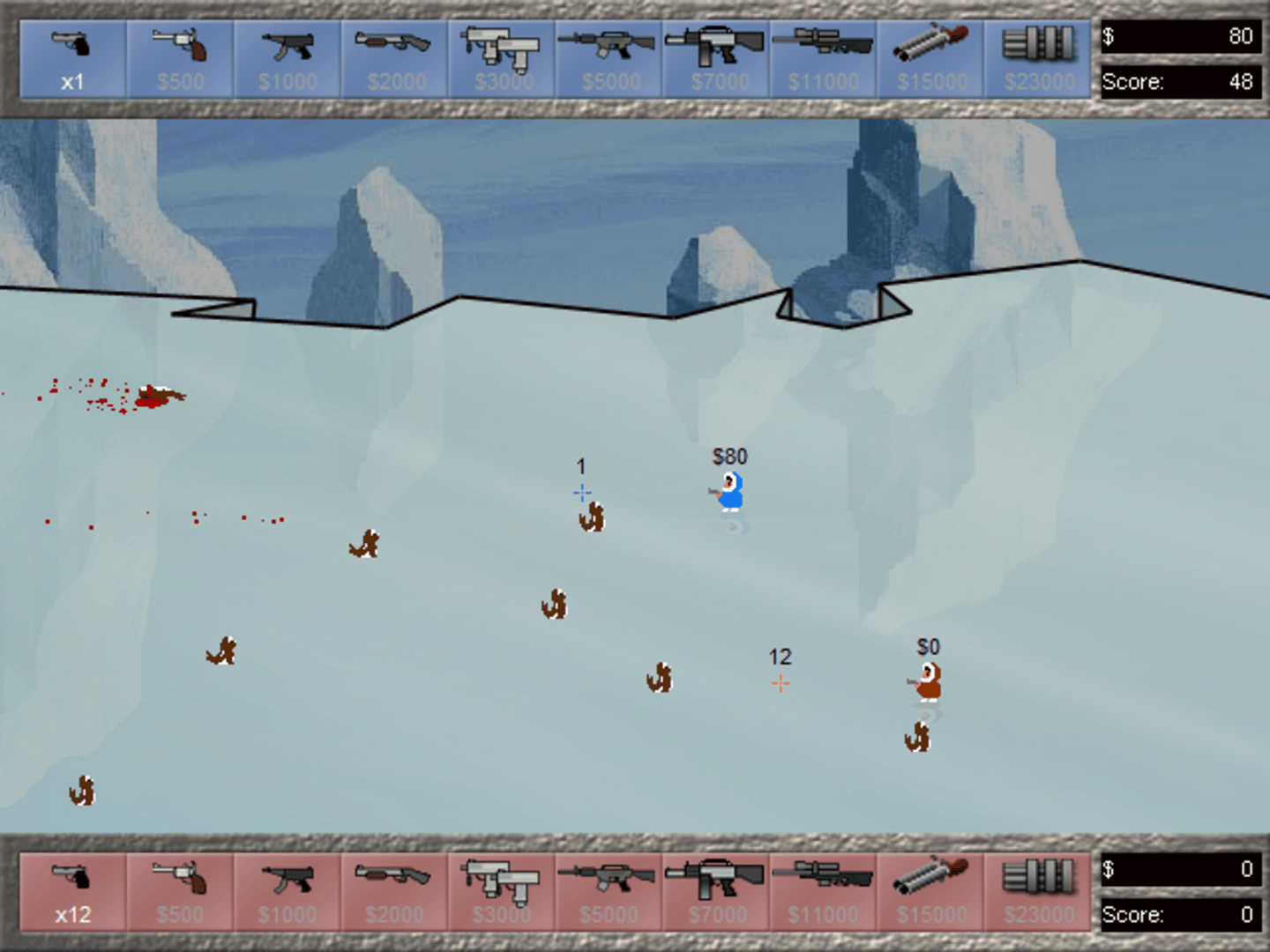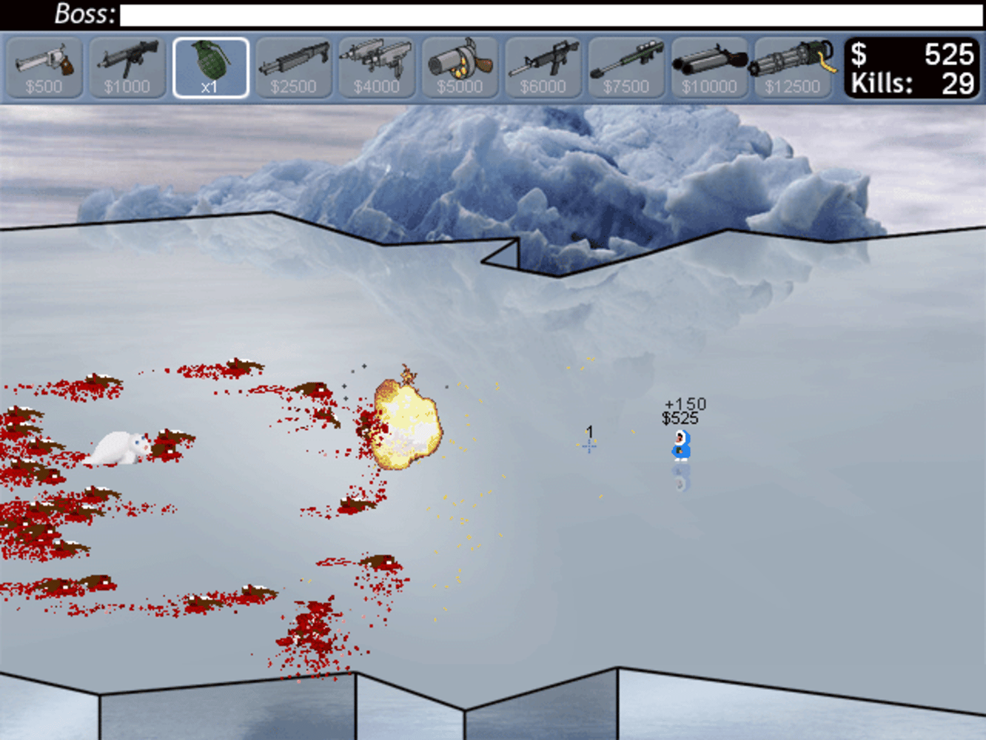Very bloody game Seal Hunter, where you will have to act as a defender of the territory from all sorts of sea creatures (and not only). Blood, plenty of weapons and the possibility to play in two make the game worth your attention. A growing population of seals is destroying all the fish in the sea. The fishermen are left without a catch, and the seals meanwhile continue to multiply and eat all the fish. Two fishermen decide to take control of the situation and get rid of the extra mouths, thus preserving the once fish-rich ocean. Along with the seals, they need to kill penguins, baby seals, and, for some reason, sea turtles and polar bears. In general, armed with a considerable arsenal, fishermen go hunting. Seal Hunter game at first glance is simple and uncomplicated, but behind all this hides a rather complex timekiller. You can't act on the fly, you won't get far. In the game you need to tactically calculate literally everything. How much ammo is left, and when the boss will appear, what weapon to buy next; what is better to kill a penguin with, and what is better to kill a seal with; how to keep a full horn of ammo in the machine gun to kill a dozen penguins in a few seconds, etc.
