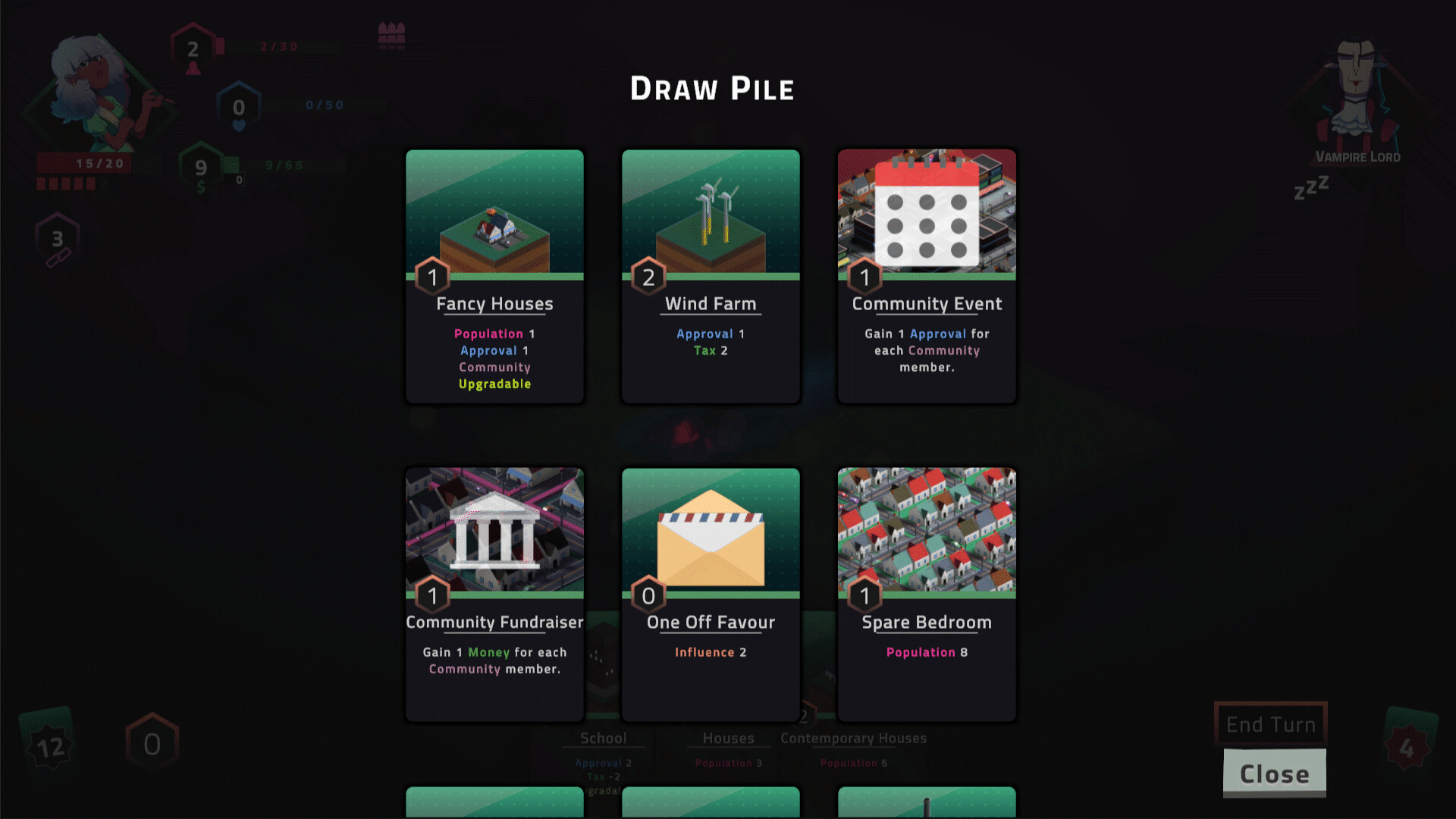 Downtown Shuffle is a chaotic mashup of roguelike deck-building, card battling, and city building! Outwit eccentric rivals—like park rangers, construction workers, and even an army of vampires—as they sabotage your reputation. Build the best city, survive the shuffle, and outlast the chaos!