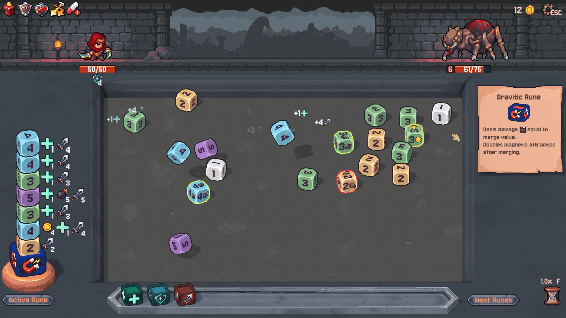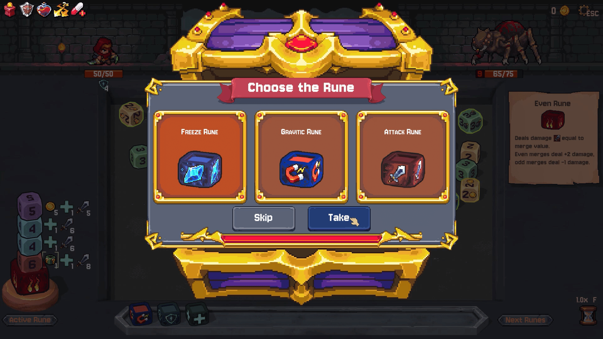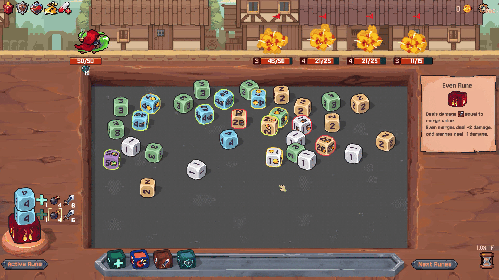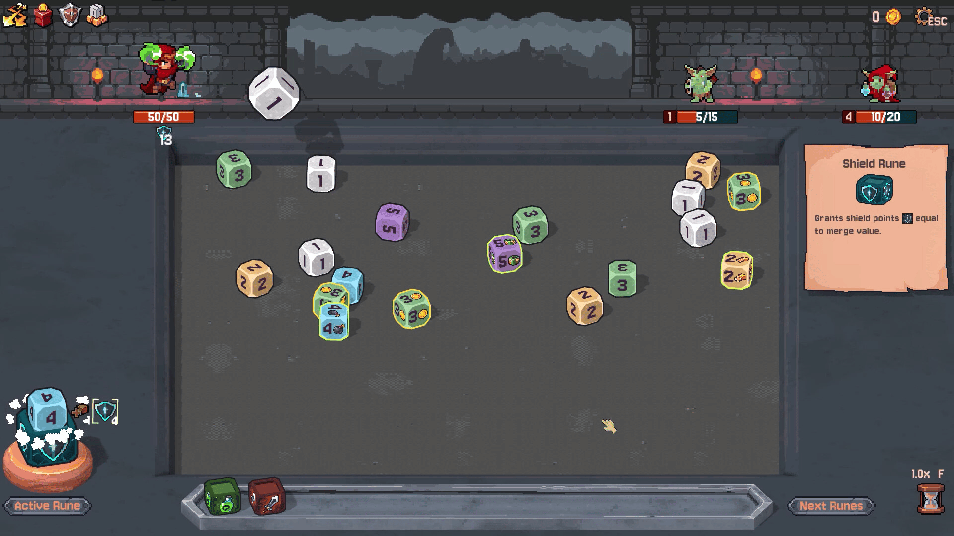 Throw dice, create explosive chain reactions, and defeat waves of enemies in Rune Dice! Collect ancient runes with diverse abilities, add synergies between relics, heroes, and special dice. All combined, this will give you an excellent experience in our roguelike deckbuilder.