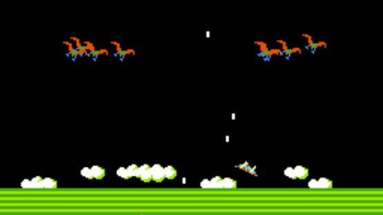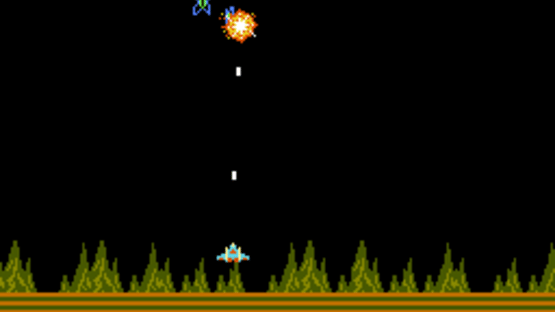 The Famicom port of Exerion is a shoot 'em up game featuring parallax effects and inertia simulation, something notable for 1983. The player travels around strange scenarios shooting aliens. The player has two types of guns: fast single shot (limited) or slow double shot (unlimited).