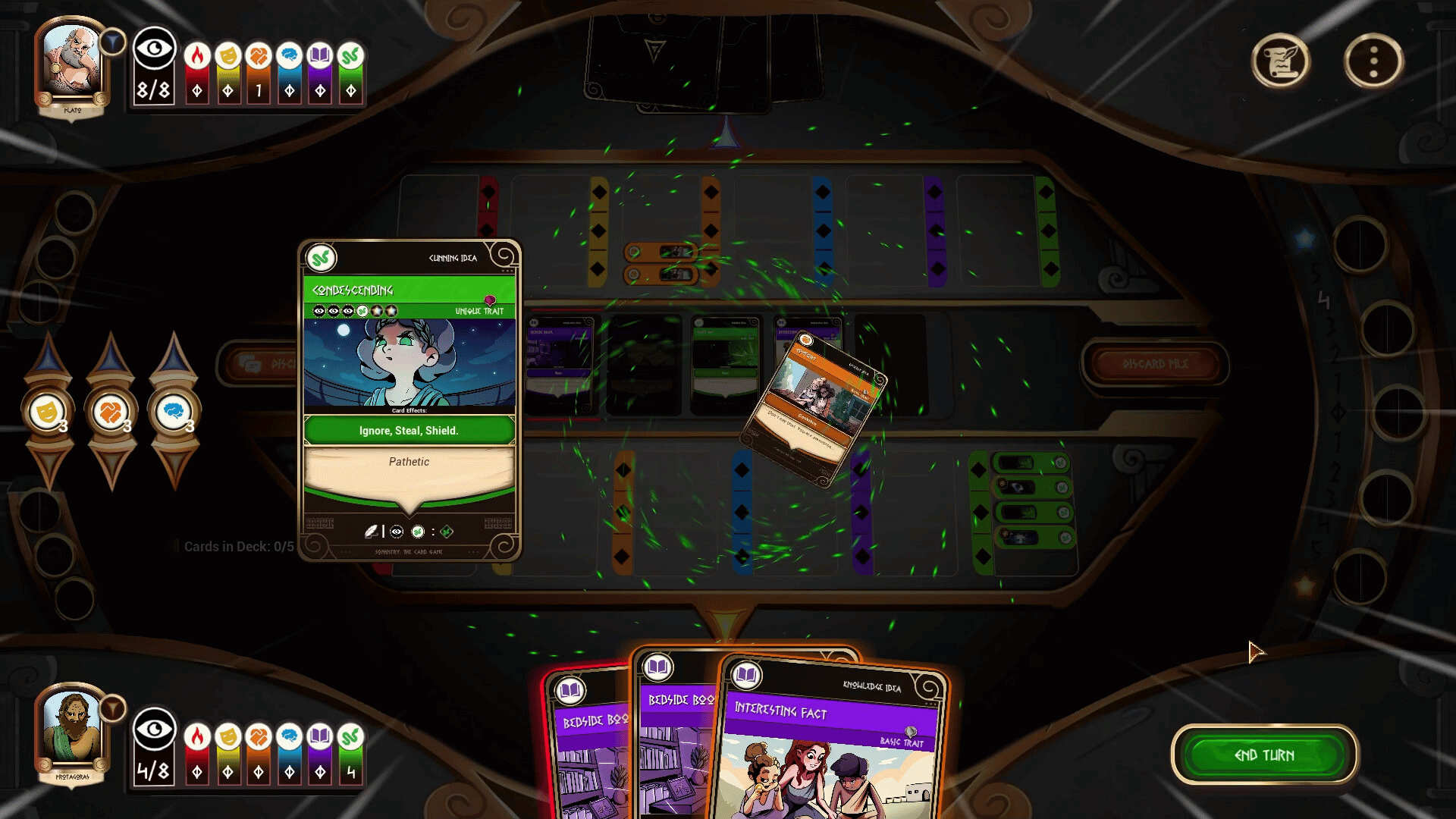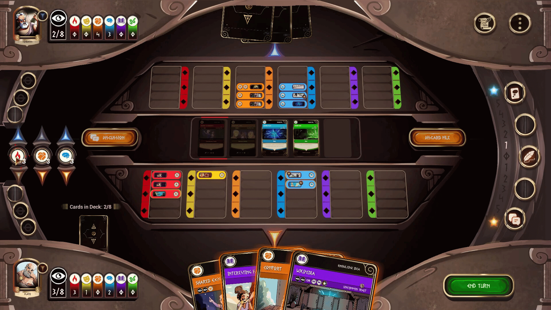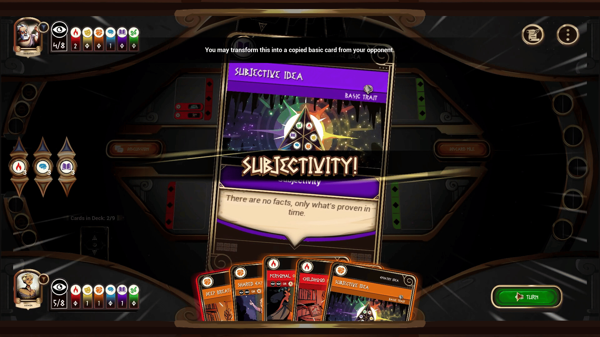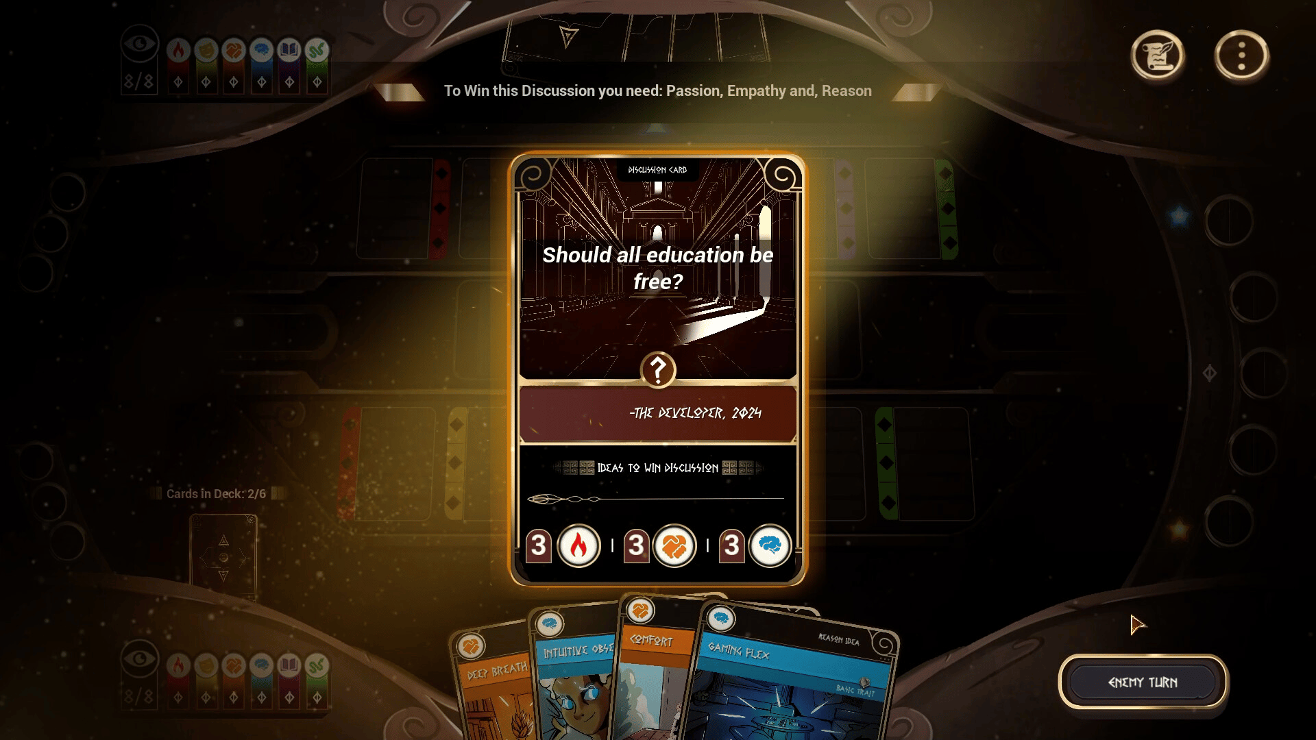 Play as a famous philosopher, build your deck, write books, and gather synergistic ideas. Engage in philosophical debates, where victory is earned by answering profound questions or captivating the crowd. Improve your philosophers and their books, create questions and lead the debate!