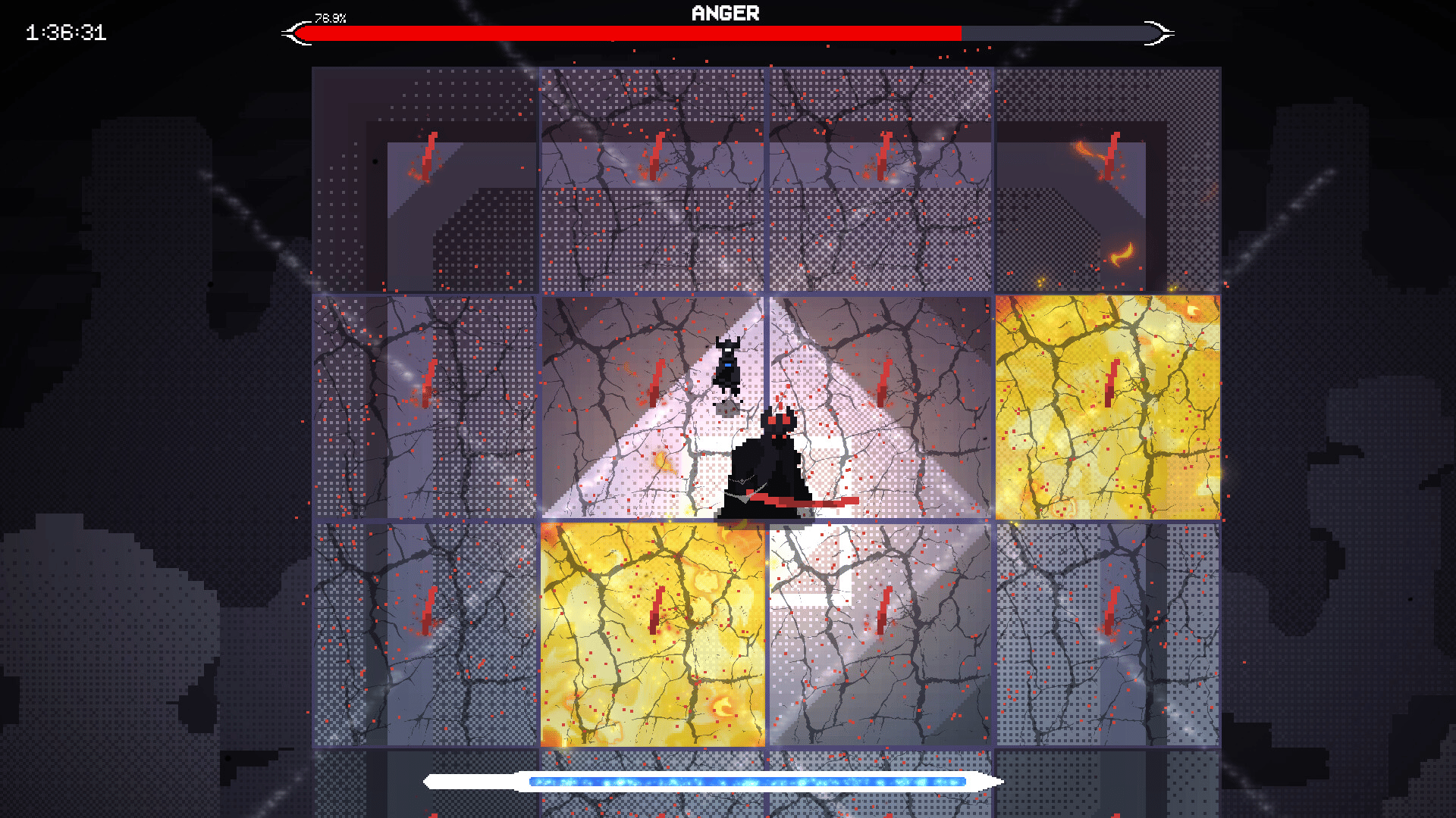 Abyssal Blade is a 2D, pixel-art "strategic" boss rush inspired by difficult mechanics in high-level MMO raids. You awaken as the Wanderer, now strong enough to confront your sorrow—with only 1 HP, conquer the five stages of grief and escape the abyss.