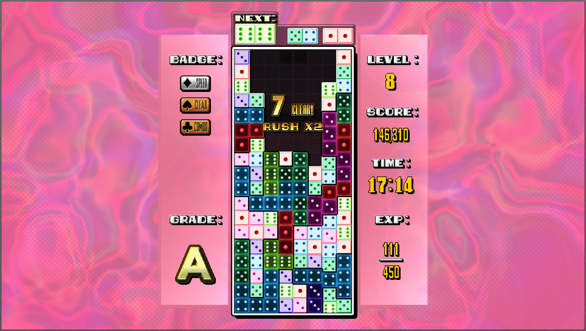 DOMINOID is an arcade-styled puzzle game about stacking dominids! CLEAR pieces by forming RINGS with matching tiles. Create huge COMBOS by stacking dominids effectively. Collect BADGES for major accomplishments. Earn EXP by clearing dominids to go towards a LEVEL UP. Can you get all the way to LEVEL 10? There's support for custom music packs, sound effect packs, background sets, and pieces. Multiple sets of backgrounds and pieces come included with the game.