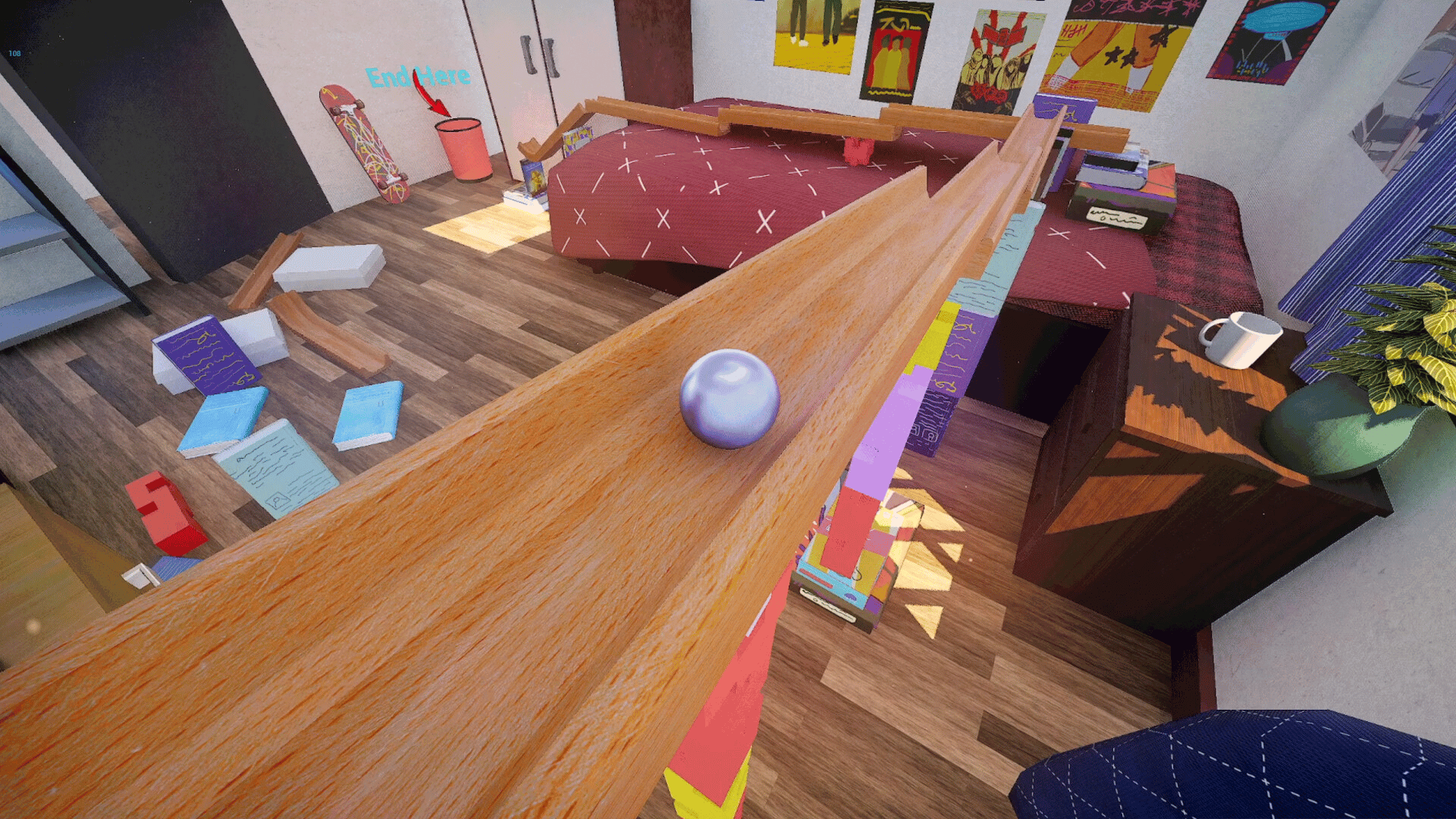 Build marble runs in a room with realistic physics. Stack random objects to make a wobbly track and watch the ball roll down! Explore puzzles with unlimited solutions and cozy vibes.