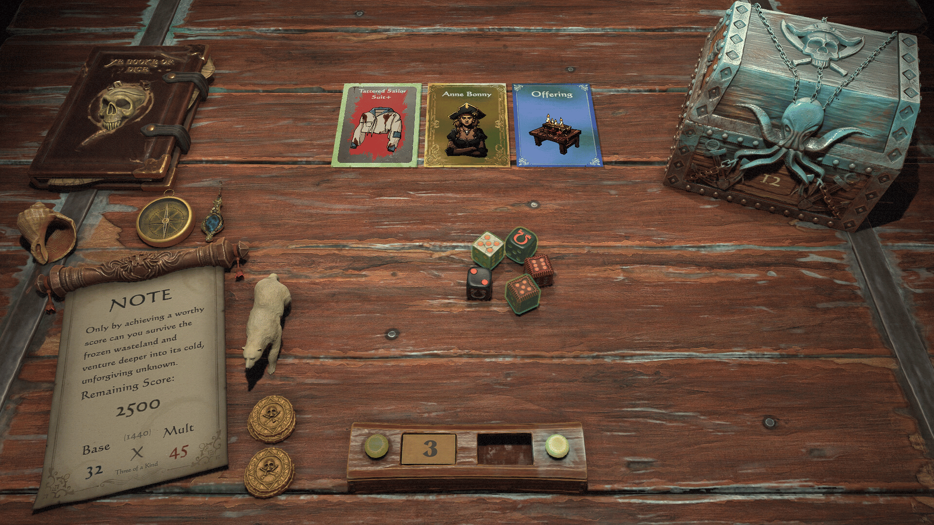 Pirate's Gambit takes you on an unpredictable voyage, blending deck-building with Yacht Dice mechanics. Roll the dice in the dimly lit cabin, where fate shifts with every turn. Are you closing in on treasure or something far more sinister?