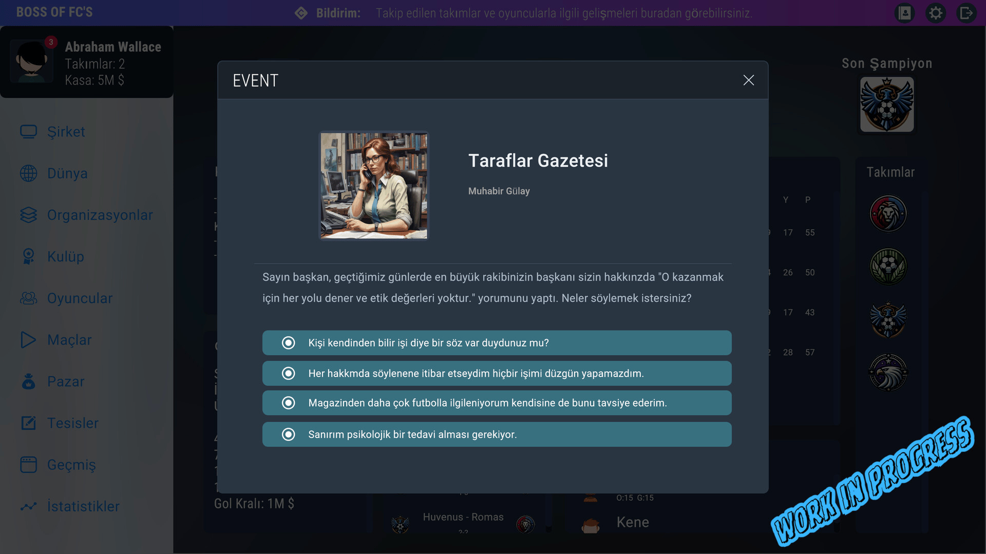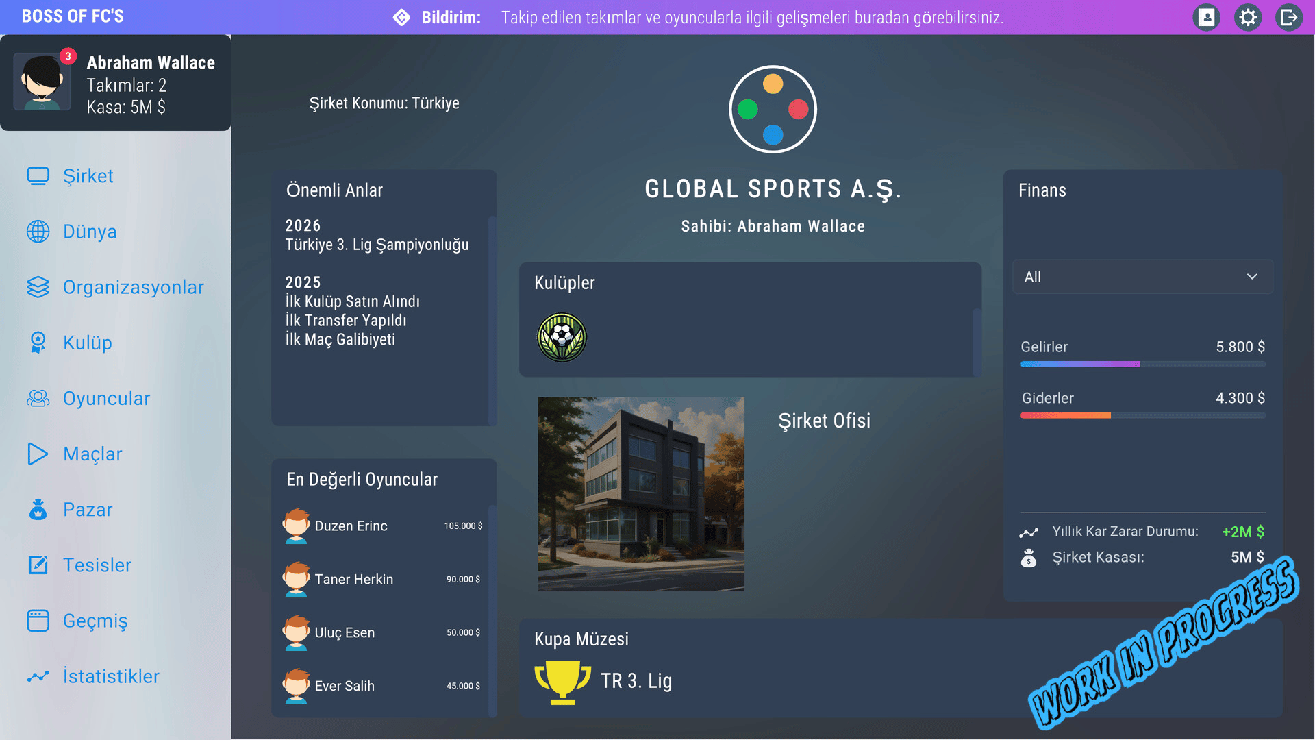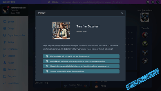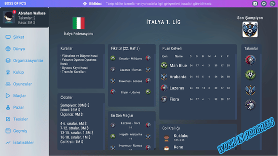 Boss Of FCs is a text-based game that includes strategy, simulation and football/soccer. You will start on this path with a certain budget and move towards success and wealth by making the right moves. Make the best deals and the best transfers, buy and sell clubs and move towards the top...