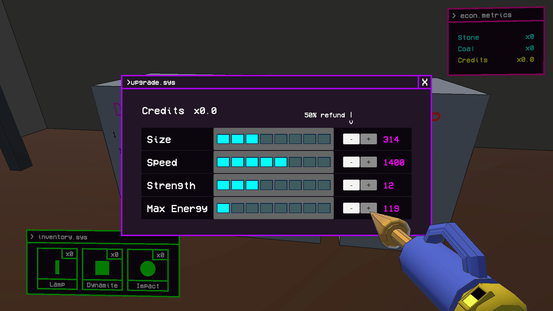 A roguelike mining game where you descend through shells of rock. Collect, Deposit, Upgrade and Profit.