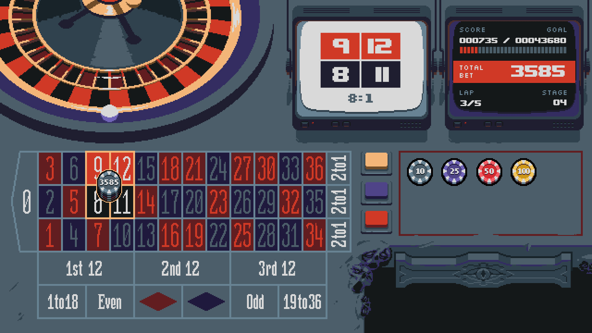 Roulette-based rogue-like with a bit of supernatural. Place your bets, use under-the-table chips and mystical sigils to claim your prize. Using your wits, a TON of luck and some help from strange places you can rise to the top of the Rouletum Casino!