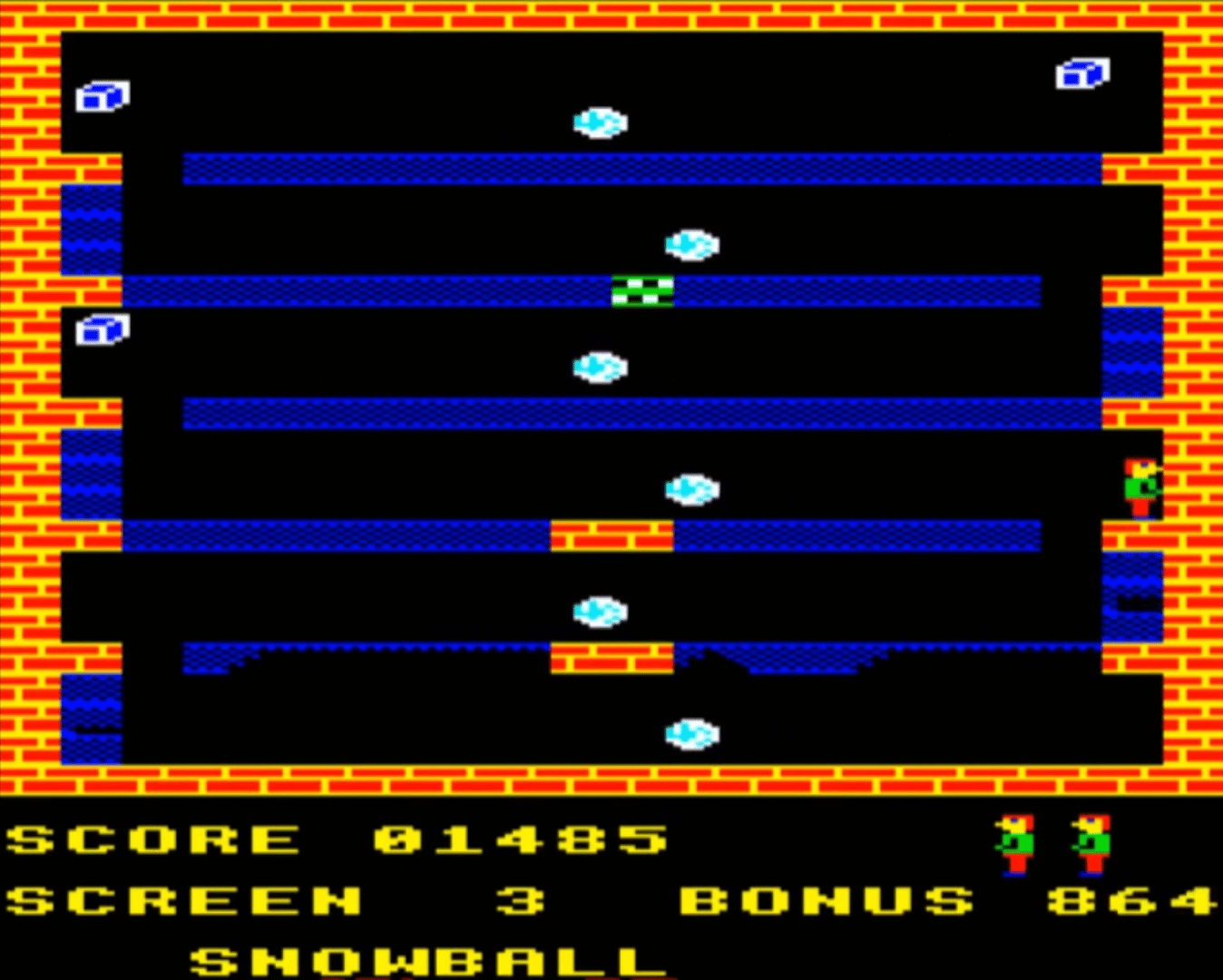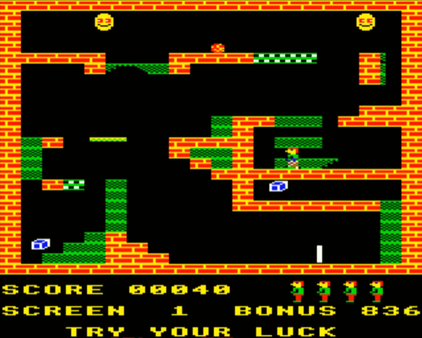 Karls Kavern is a platformer in the style of Manic Miner. It consists of thirty single screen levels where the objective in each is to simply collect all the boxes that lies scattered around. To make it the player has to jump between platforms (including moving ones) and avoid getting touched by any of the dangers that exist in the underground. Any contact will lead to a loss of life and so will a long fall. Part of the levels are also collapsing platforms and conveyor belts. The player has five lives and when they are all used up the game ends.