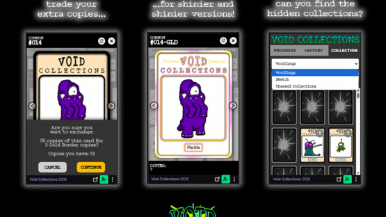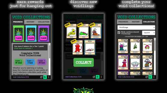 The Void Collections Collectible Collections Game is a Twitch extension minigame that lets followers earn packs of collectible digital cards by hanging out in a channel! Viewers are rewarded for the cumulative time they keep a channel open. With original art depicting strange and creatures called "voidlings" that range from creepy to cute, you'll want to collect them all! As if collecting all the voidlings wasn't enough: can you collect all the collections? Exchange extra copies for shinier and shinier versions! Plus, there's a chance to find special version of some cards, and fill in even more hidden collections...