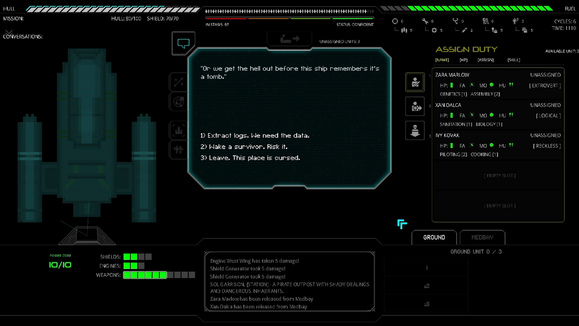 Congratulations, Commander! You've been prematurely awakened from cryosleep to fix everything. Hope you like impossible odds, and pressing glowing buttons to decide who lives, dies, or gets spaced. Keep the ship running, the crew alive-ish, and the existential dread manageable.