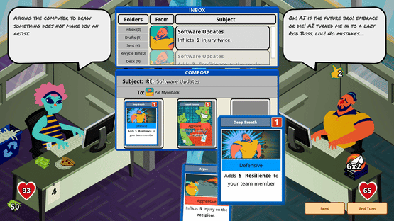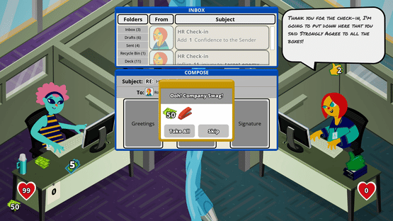 A single-player roguelike deck builder, where email is turn-based combat. Use your cards to compose emails, create combos, and defeat the hordes of middle managers. Climb the corporate ranks by building your deck and strategically navigating your calendar to uncover the corporate conspiracies.