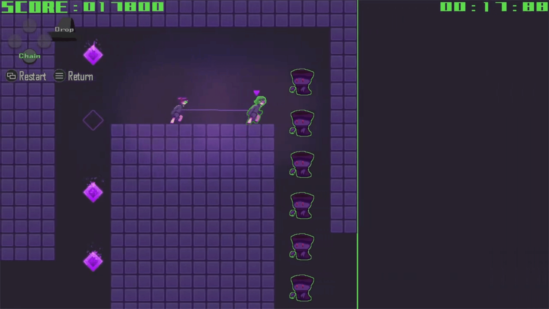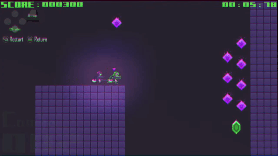Chainer is a 2D action game in which heroines "Yua" and "Maki" cooperate to reach the goal using the technique "Chain" that throws a partner forward.