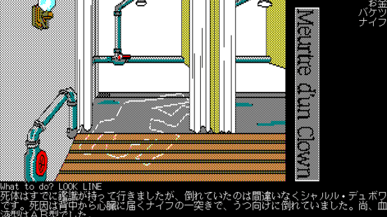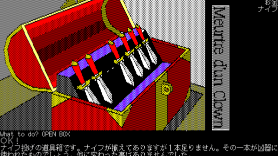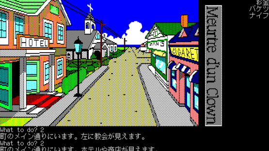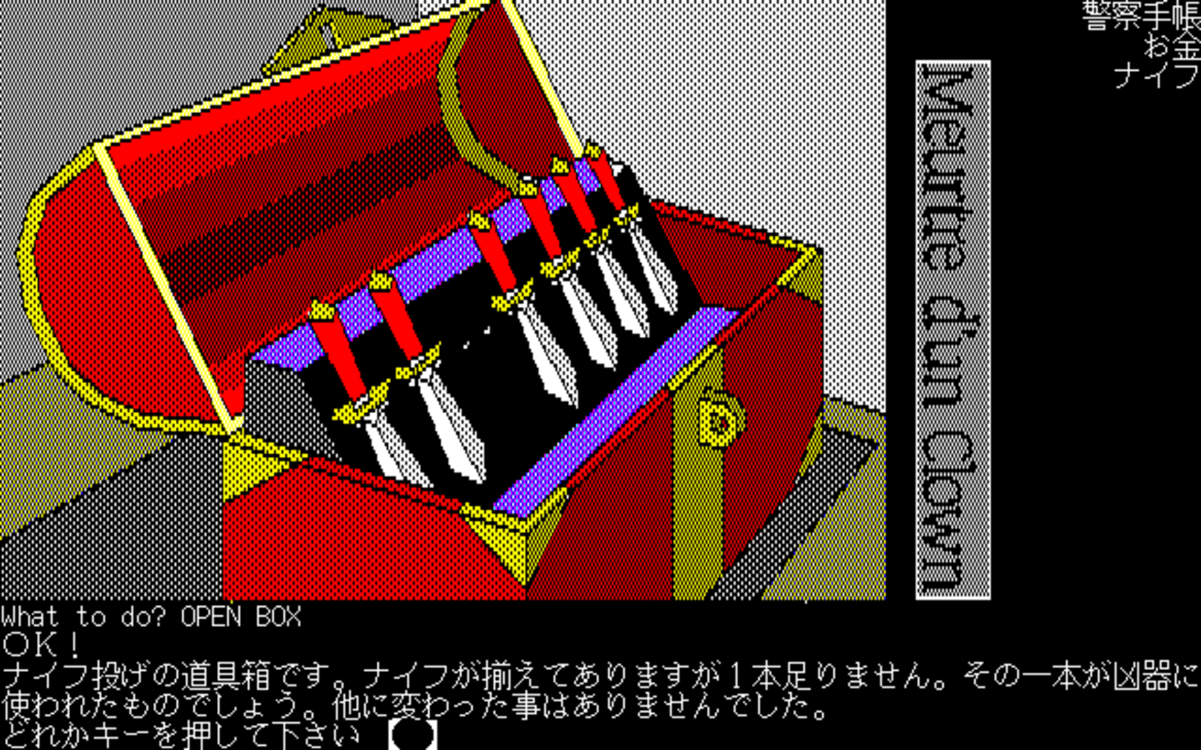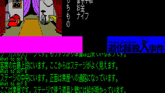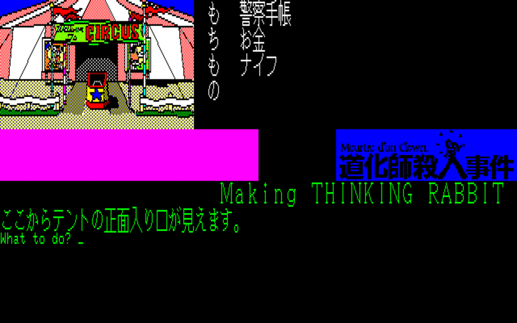 Doukeshi Satsujin Jiken is a graphic text adventure game in which you take the role of a skilled detective from Scotland Yard who must explore the circus and nearby town searching for evidence and questioning suspects to solve this case. The commands can be entered in both English and Japanese.