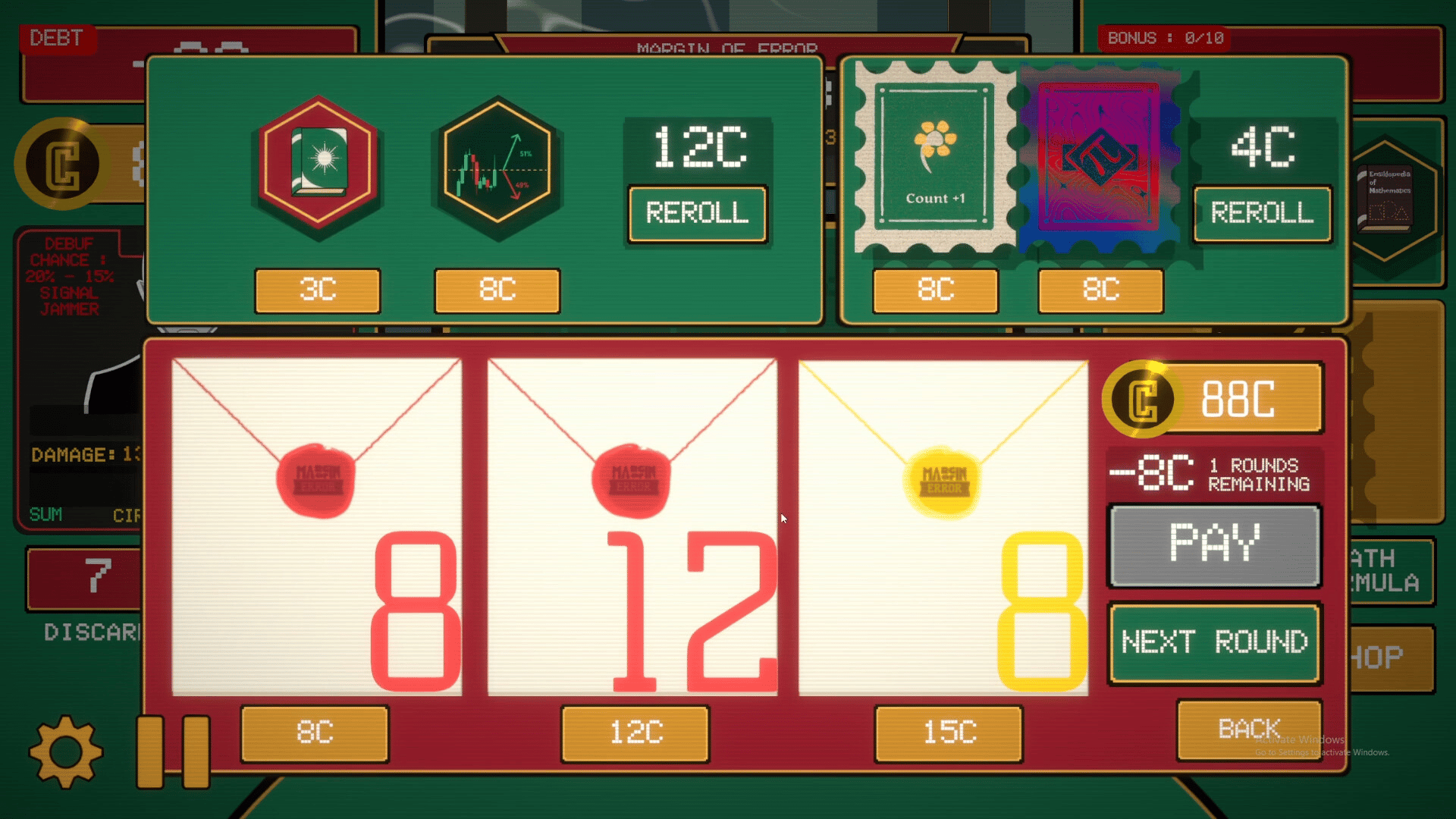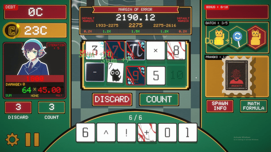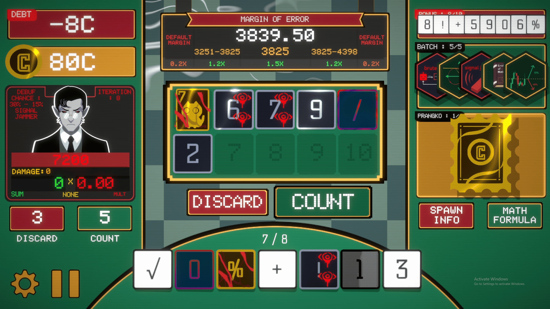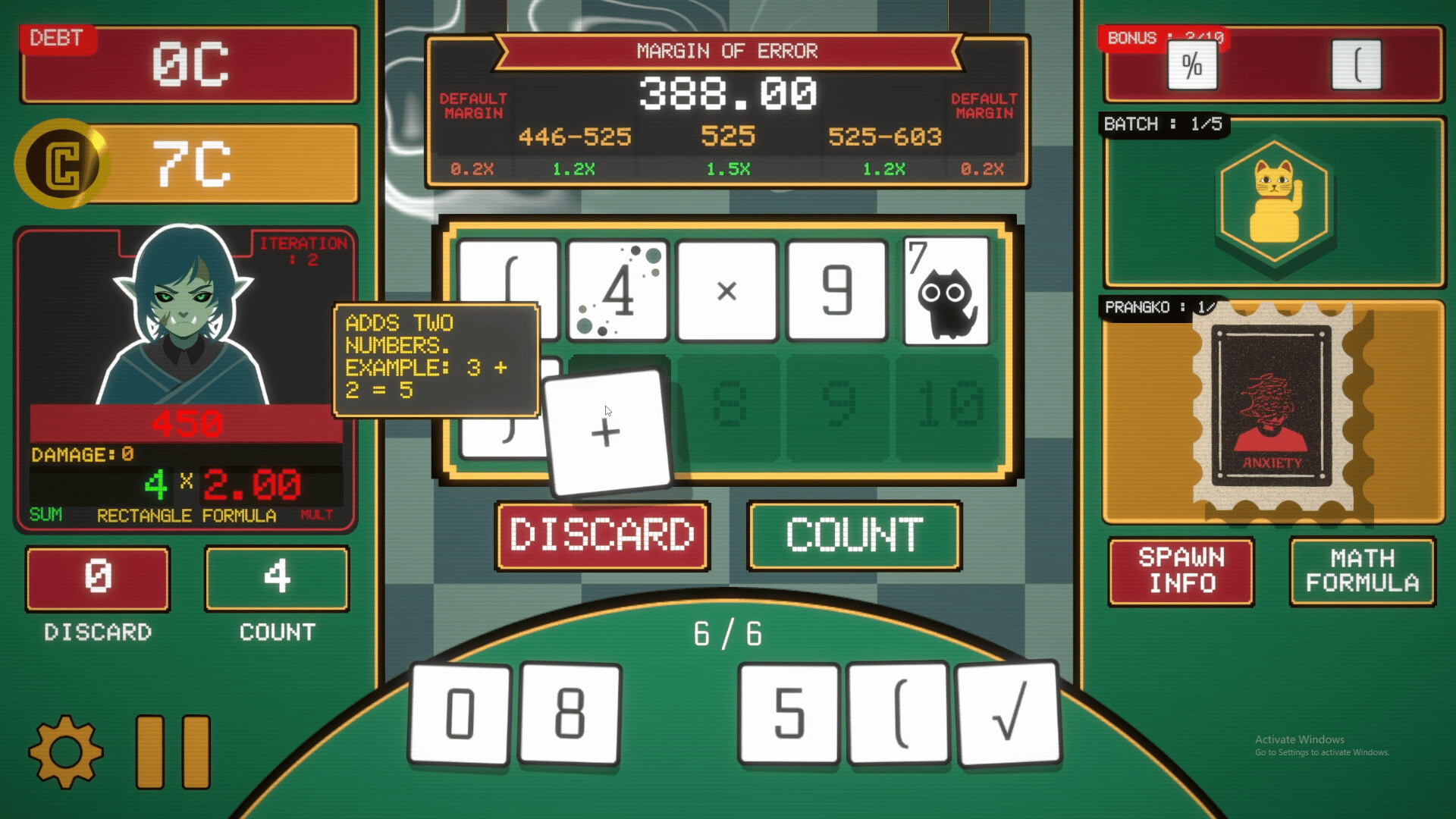 Margin of Error is a Balatro-inspired roguelike deck-building game with a mathematical puzzle twist, where you play not just with numbers - but also with logic and strategy. it features a card system with numbers 0-9 and unique operators like +, -, ×, (pi), etc.