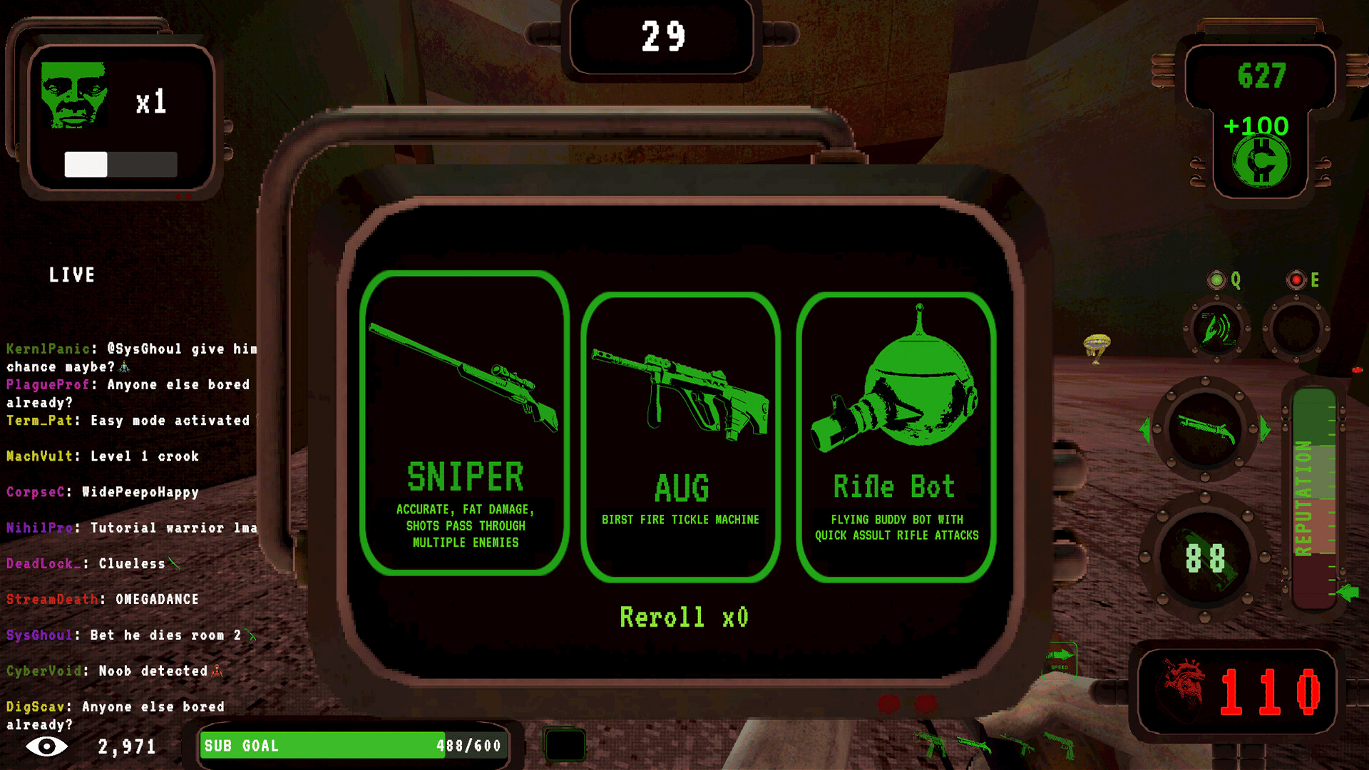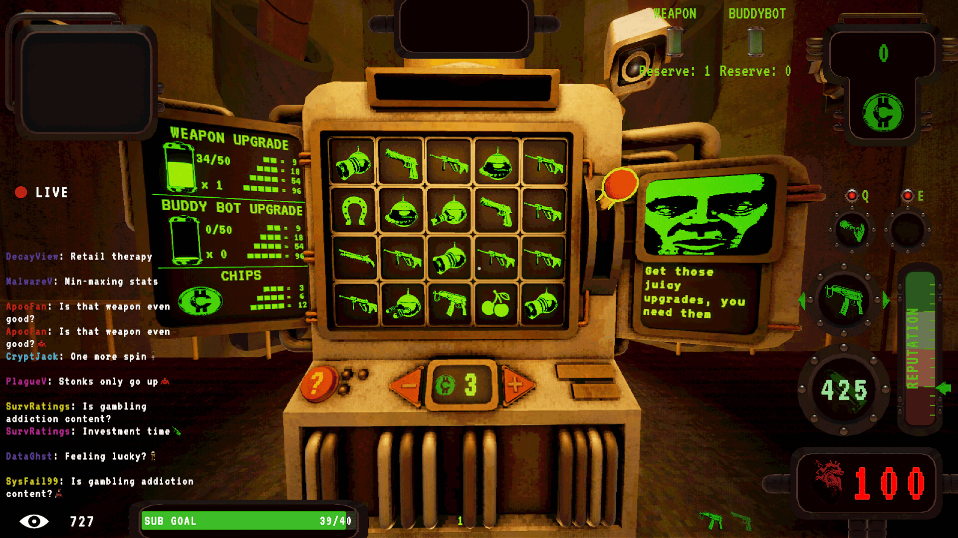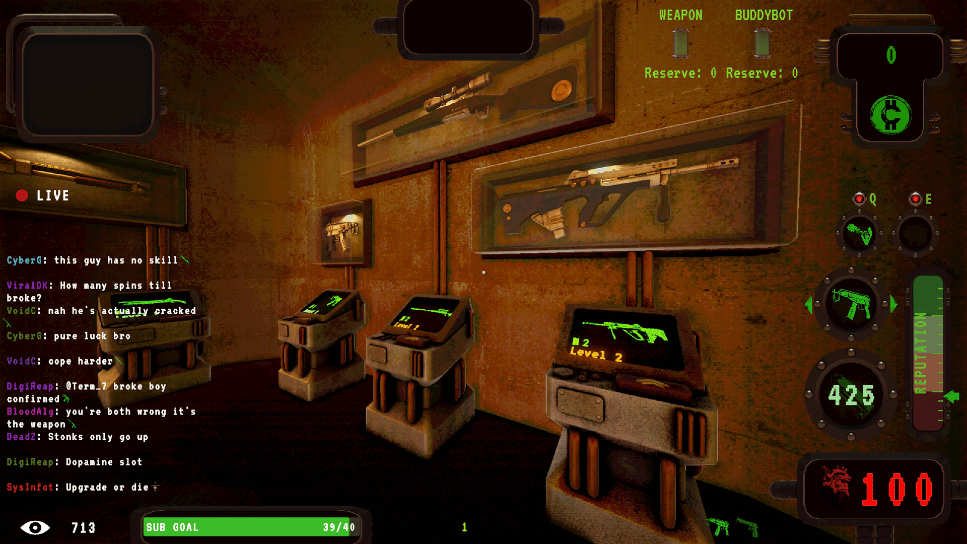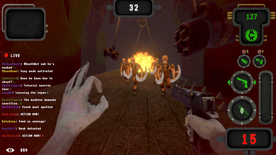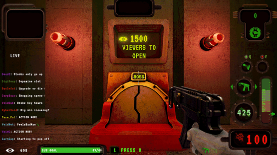 Roguelike shooter set in a dystopian, livestreamed gameshow. Obliterate waves of deformed freaks, earn donations from your sadistic audience and gamble your earnings for upgrades. Your life is a Performance. Your Death is Content.