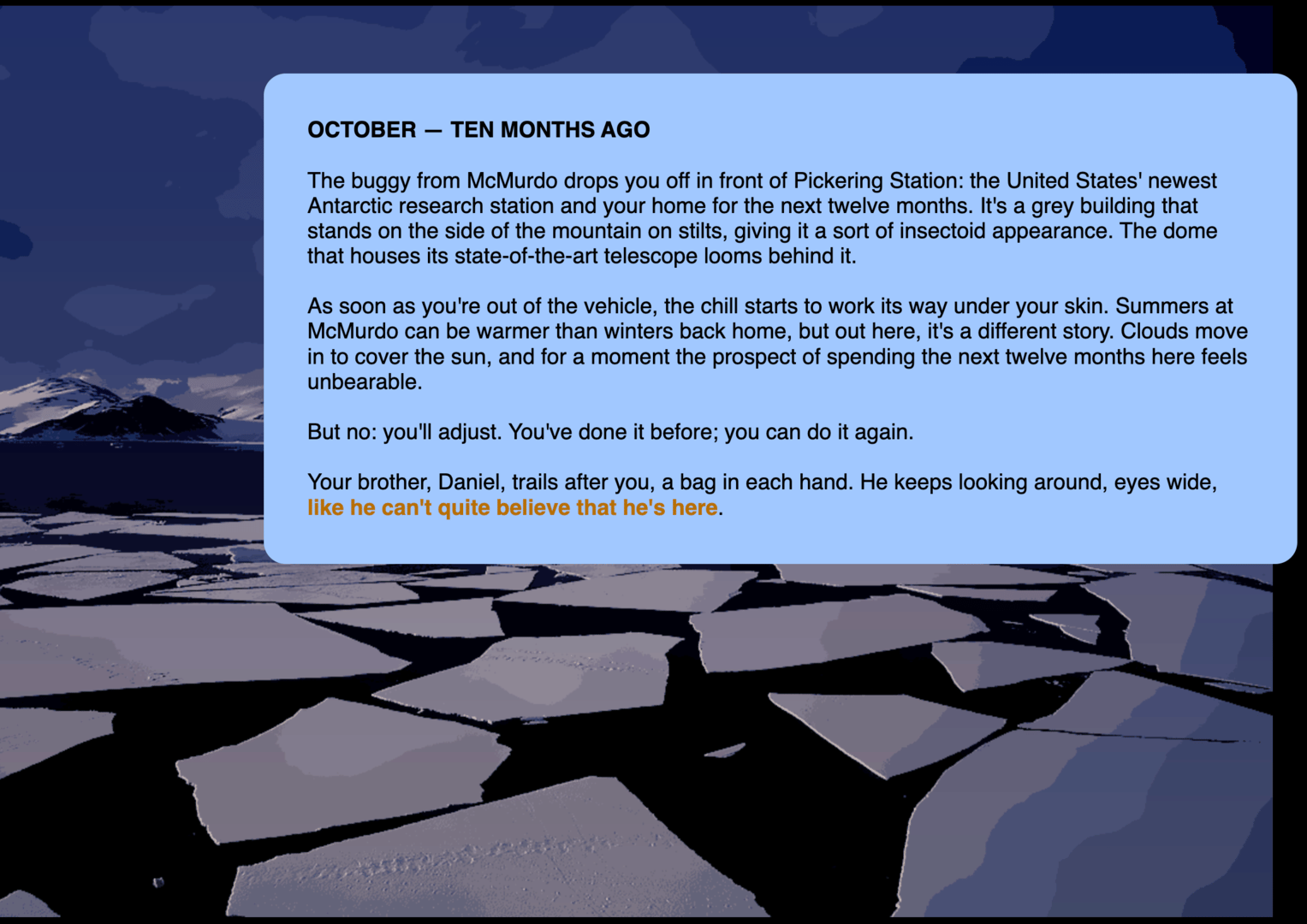 Pickering Station, Antarctica: A place of science, knowledge, and deep isolation. When the last plane leaves for the winter, you and your colleagues may as well be on Mars. At least this winter-over has gone well so far — or as well as can be expected with a dozen or so eccentrics locked up together. But then someone turns up dead... You have ten days until the next plane arrives and law enforcement takes over the investigation, and by then the perpetrator will have covered their tracks. Can you bring them to justice first? And can you keep your sanity in the process?