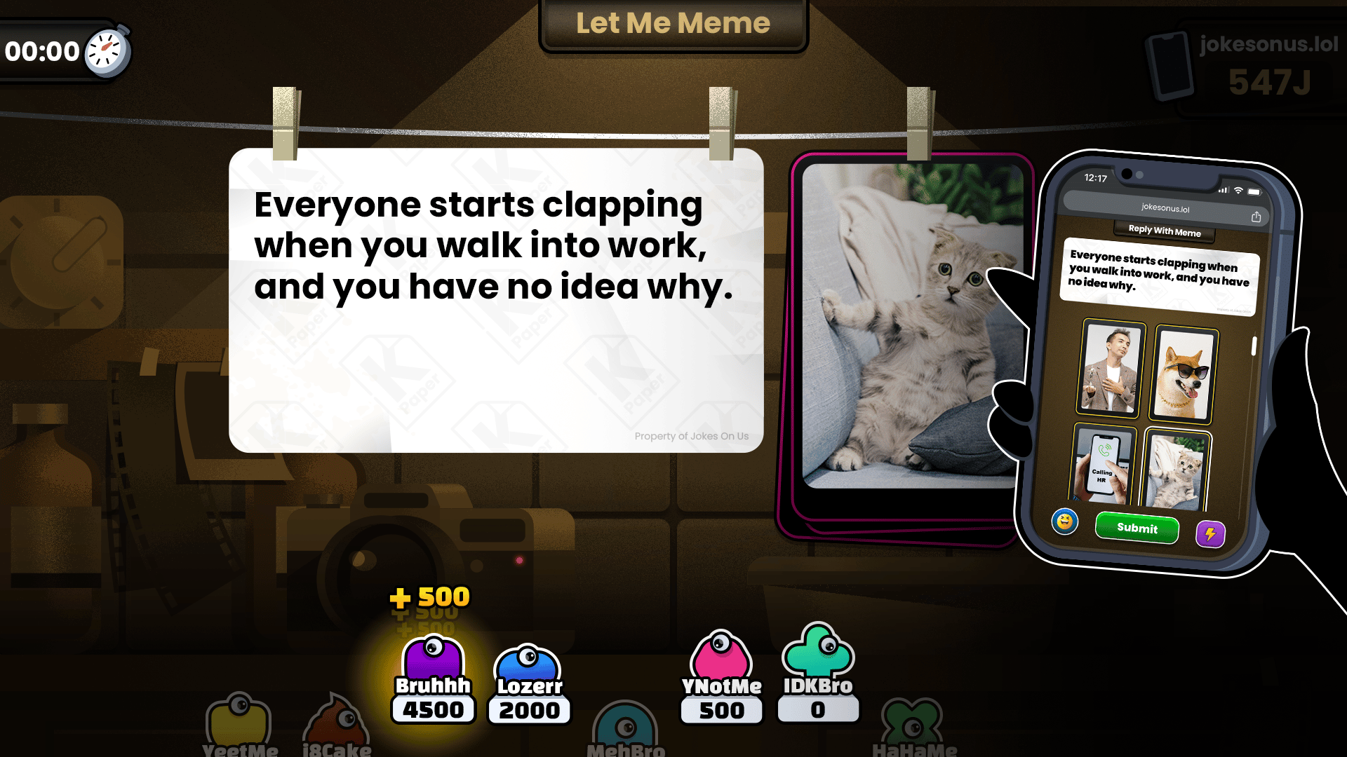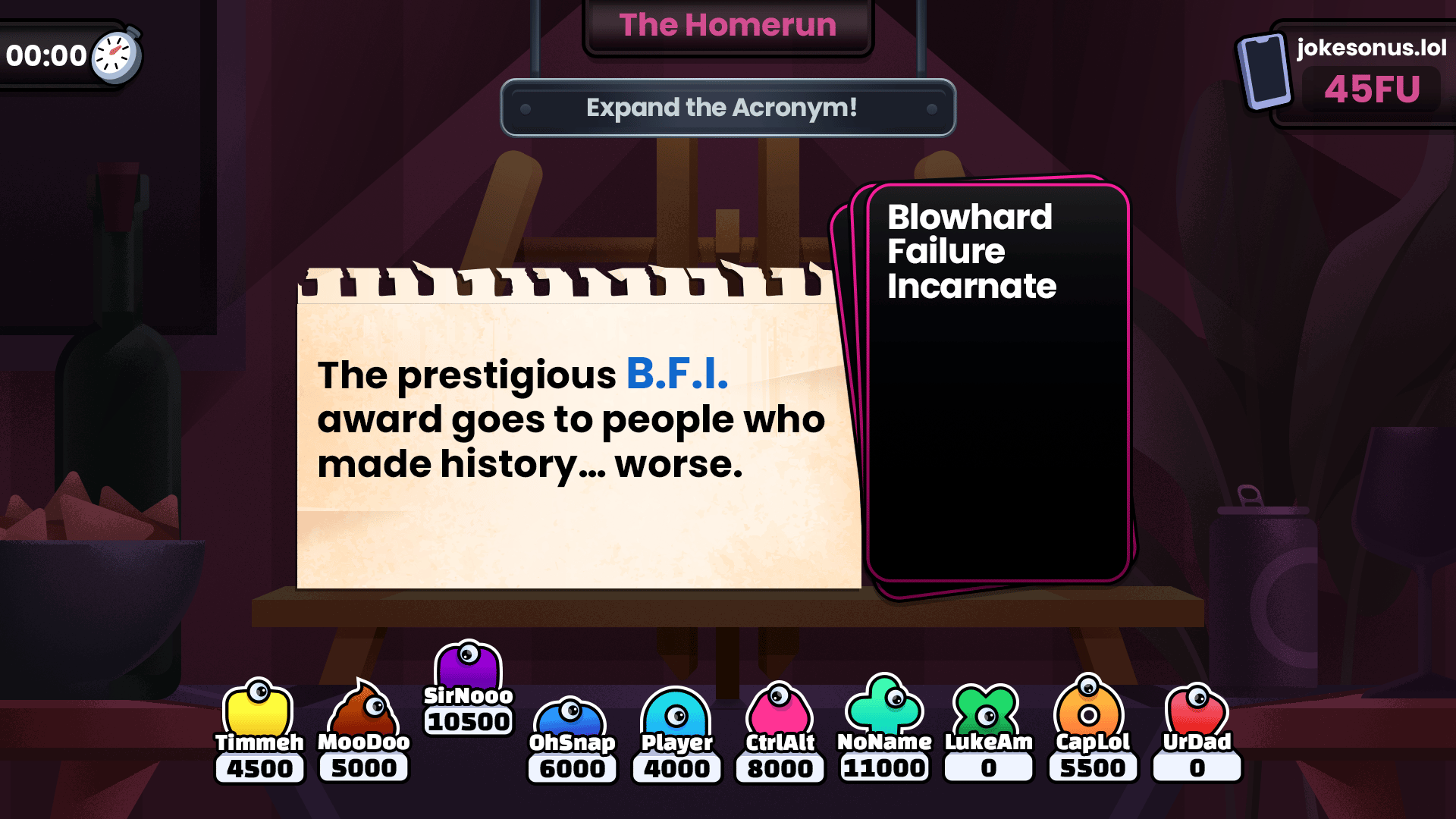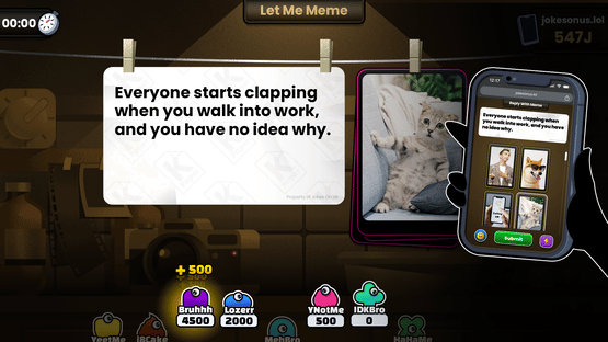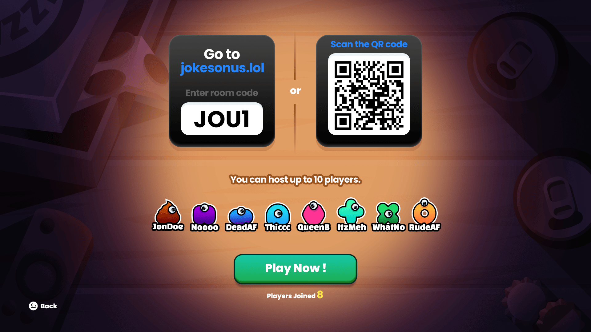 Level up your house parties and game nights with Joke's On Us, an online party game that will keep everyone laughing all night and the next week after. Use your phone as a controller to play five unique joke-writing and reaction game modes, with a little help from a semi-delinquent raccoon who may or may not be trying to move in with you. Play with up to 10 people, toggle NSFW content, and choose from several expansion packs for a new experience every time you play. Have a blast!